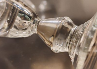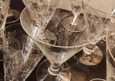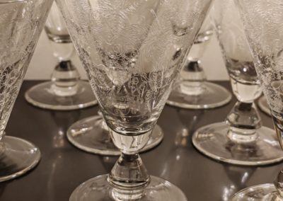11 Verres coniques en Cristal Gravé sur toute la paraison d’un motif végétal spiralé. Jambe boule et pied rond lisse. La gravure est magnifiée par la boisson servie.
