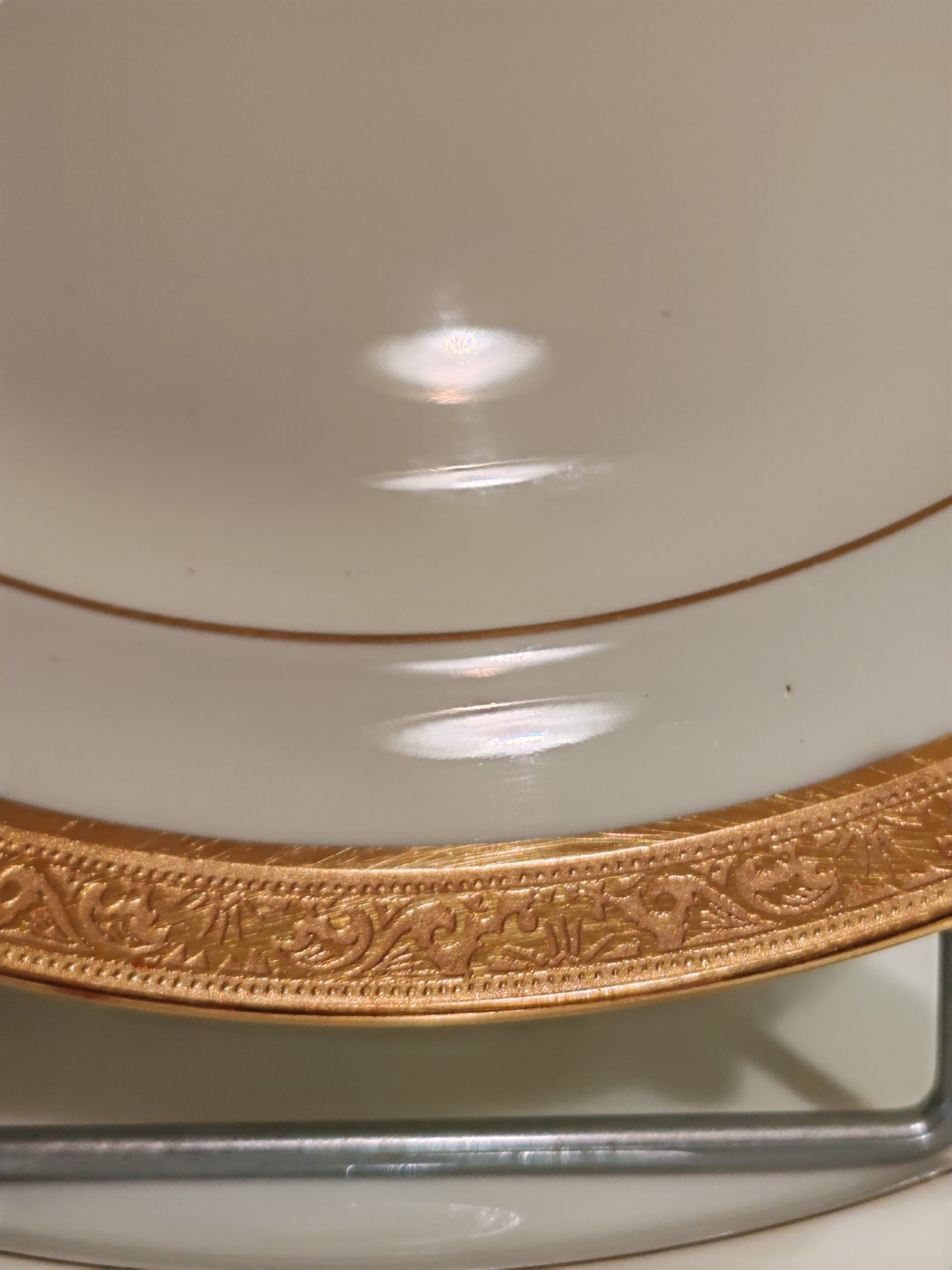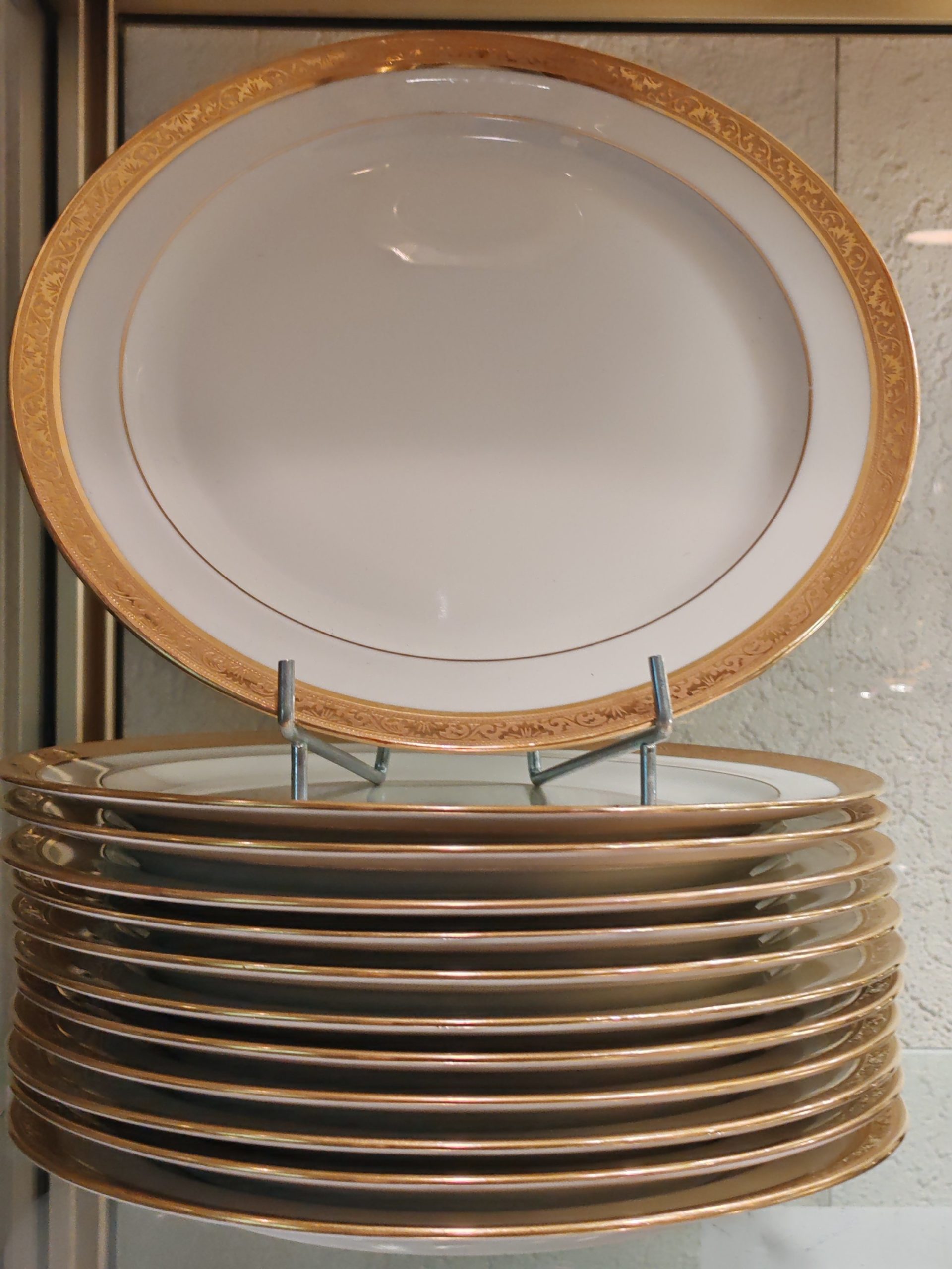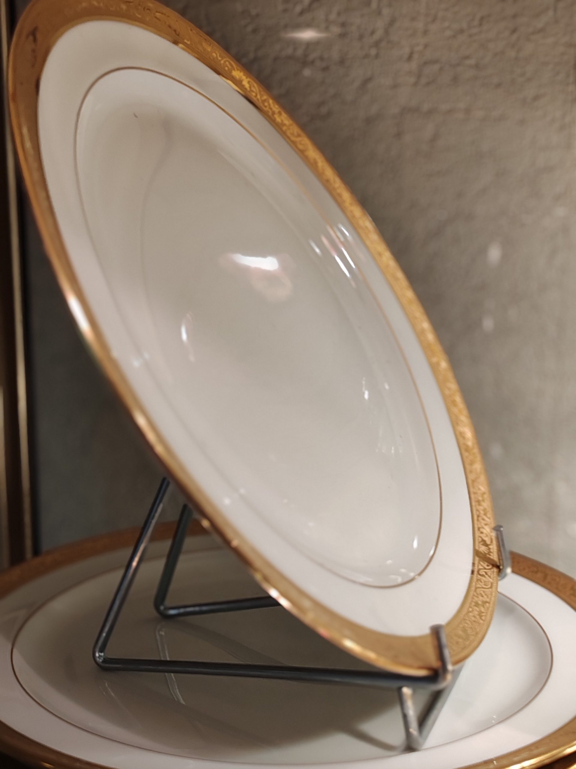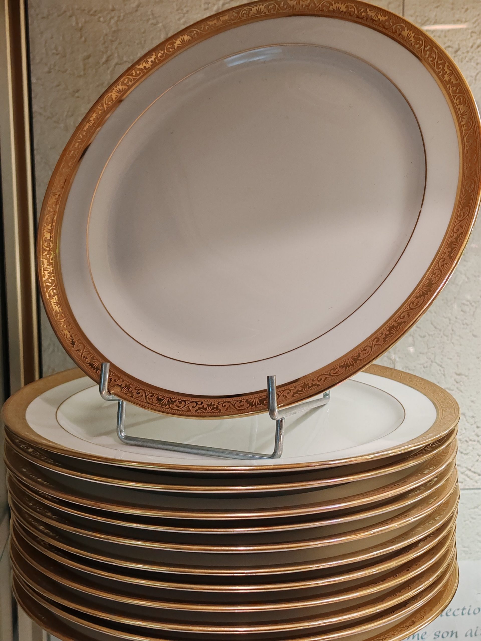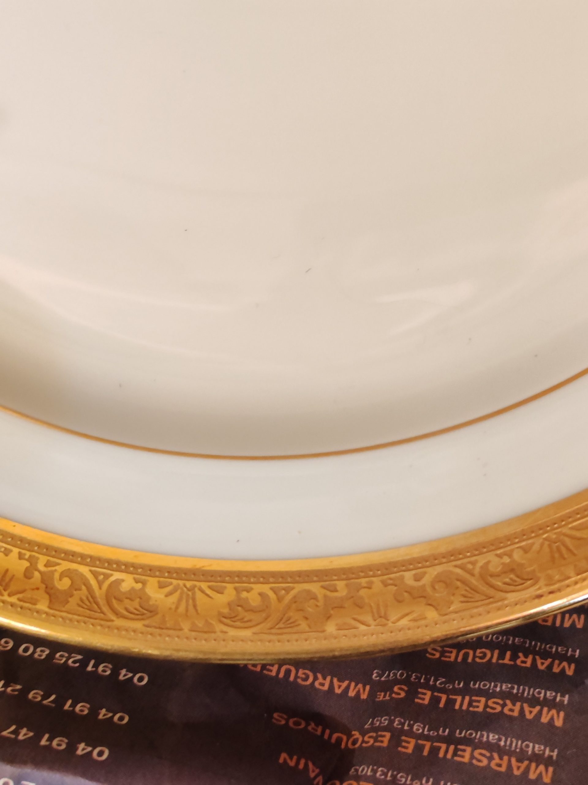 12 Assiettes en Porcelaine de Limoges de la Maison Raynaud et Cie. Son décor présente un filet en or en bordure intérieure de marli et une superbe frise de 12 mm en relief Incrustation en double dorure à l’agate.