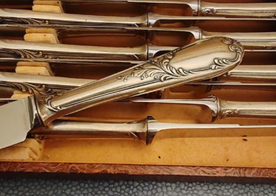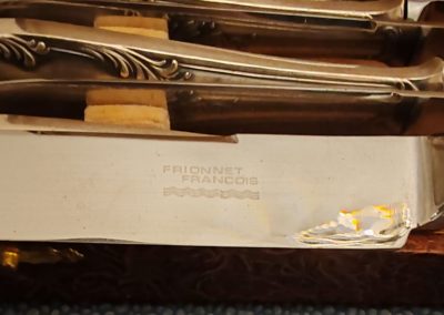 12 Couteaux en Métal Argenté style Rocaille Frionnet François début XXÈME. Très belle argenture. Lames en Inox signées. Poinçon de l’orfèvre sur les manches