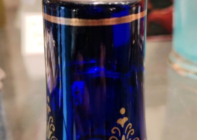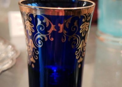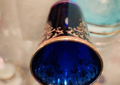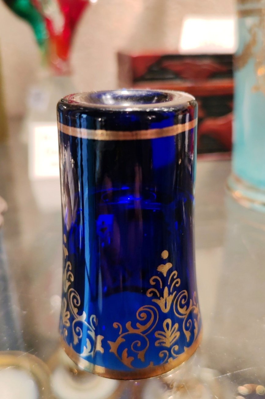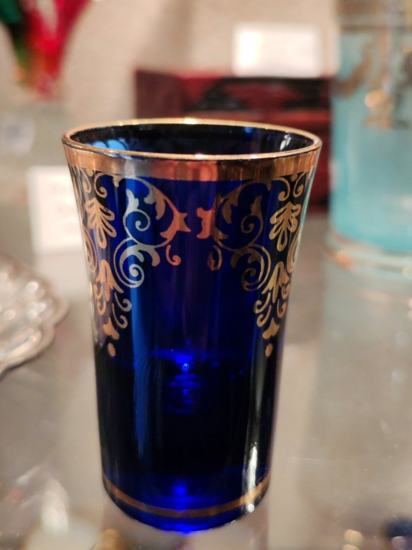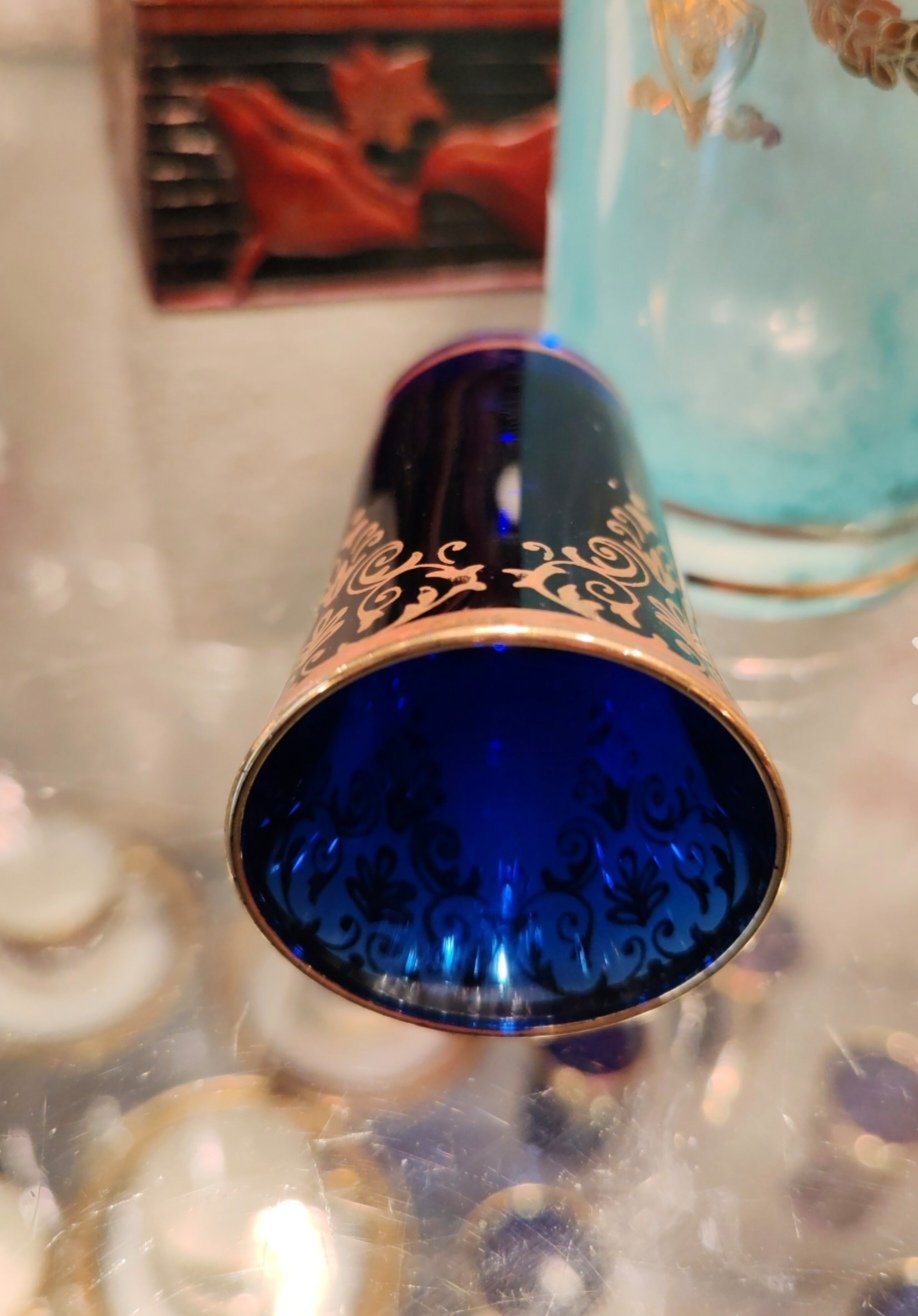 6 Verres à Liqueur de couleur bleue Cobalt avec motifs et entrelas or. Époque Second Empire. Dorure Très légèrement effacée à quelques endroits dûe à l’usure du temps.