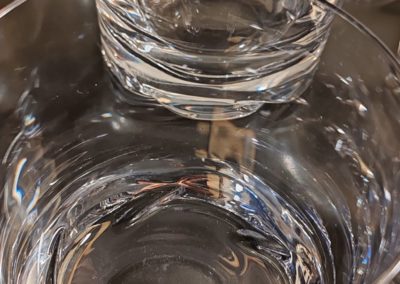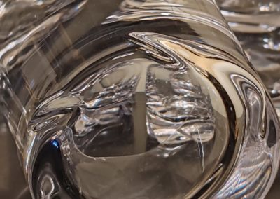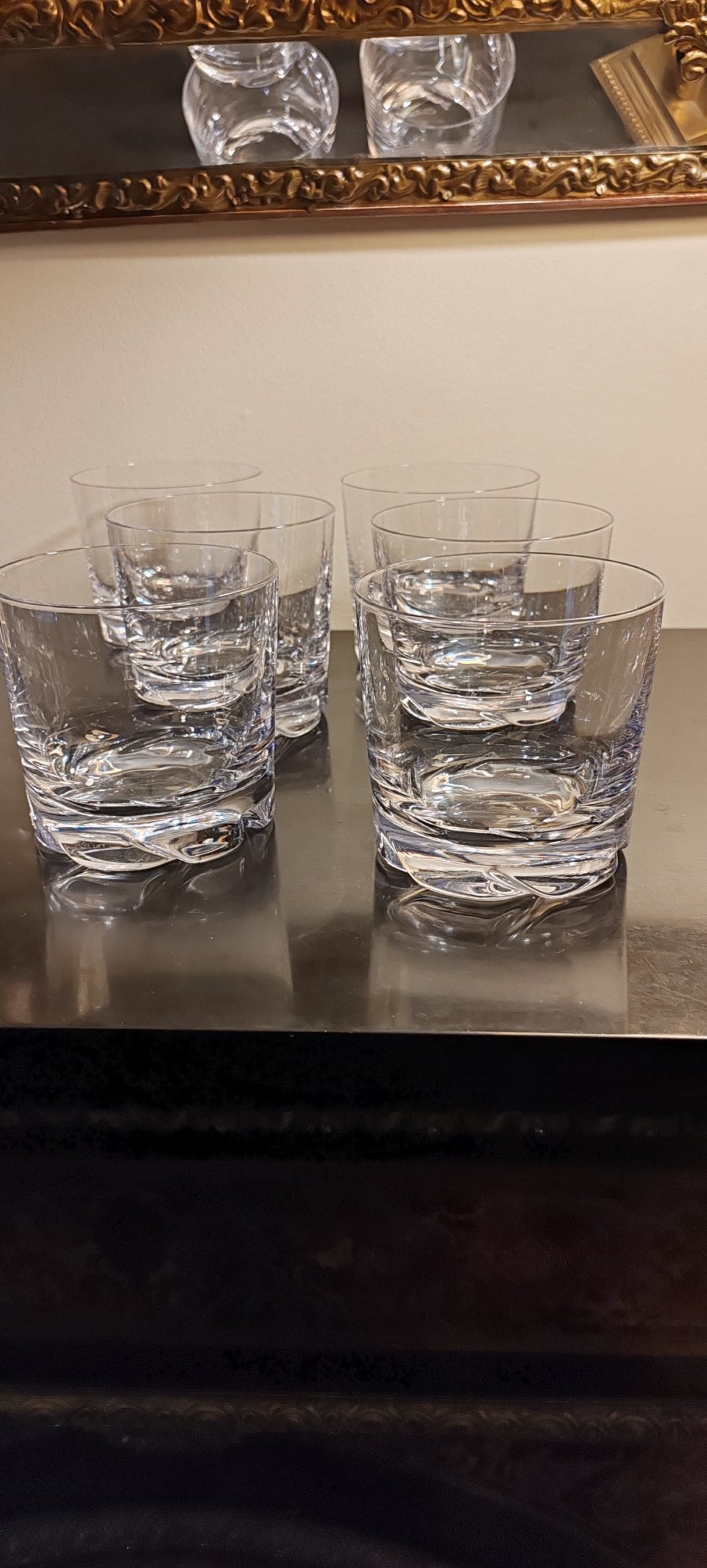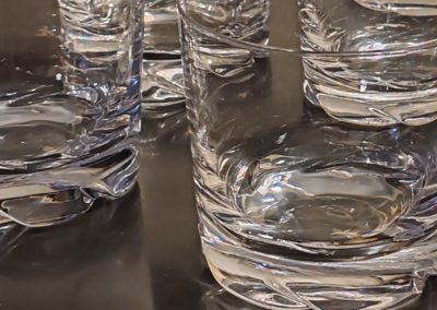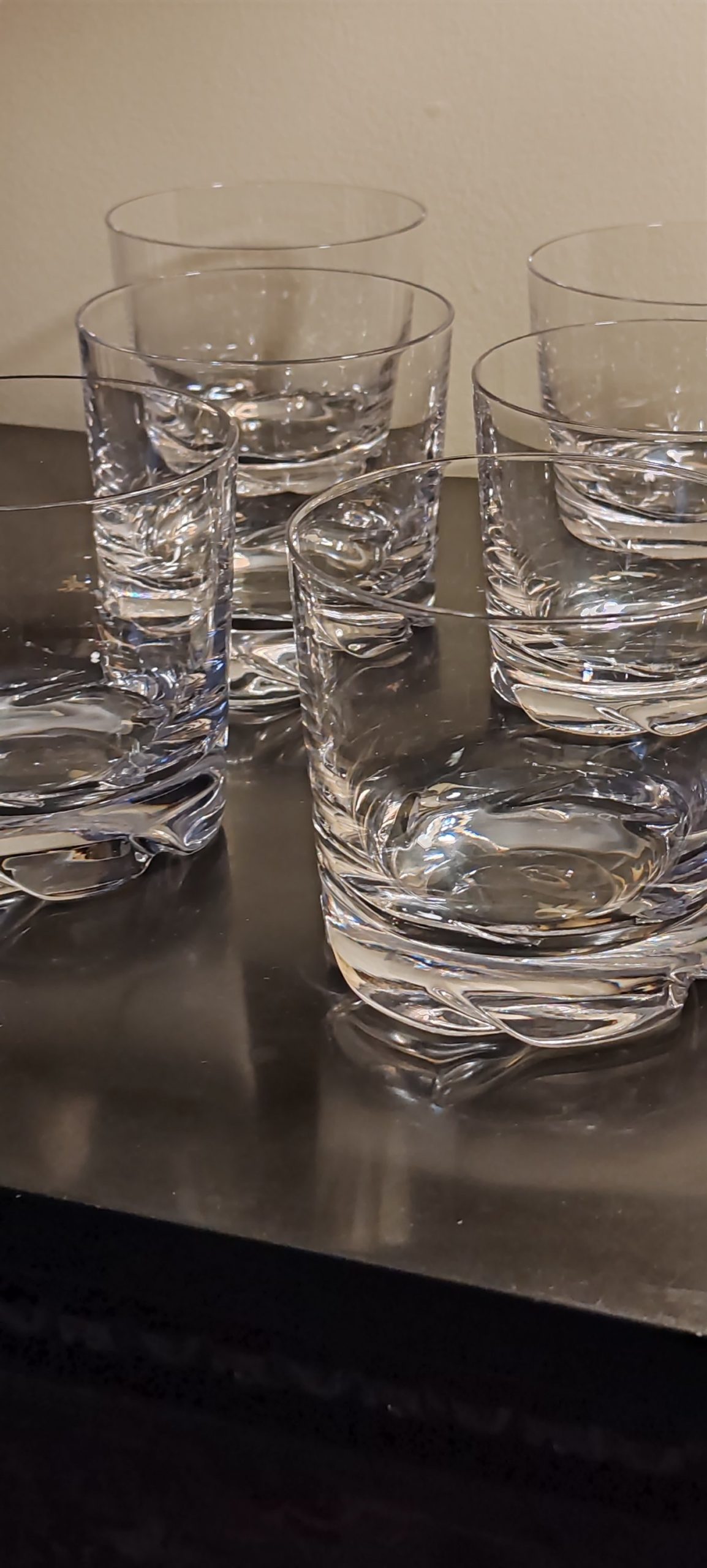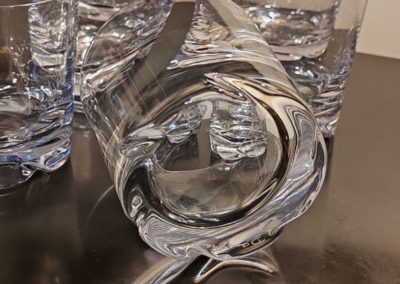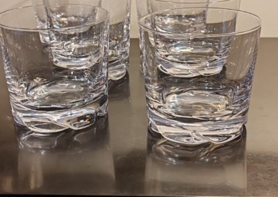 6 verres à Whisky en cristal, modèle « Blanzey » crée en 1966. IL s’agit d’un Cristal clair transparent à base épaisse moulée de flammes obliques.