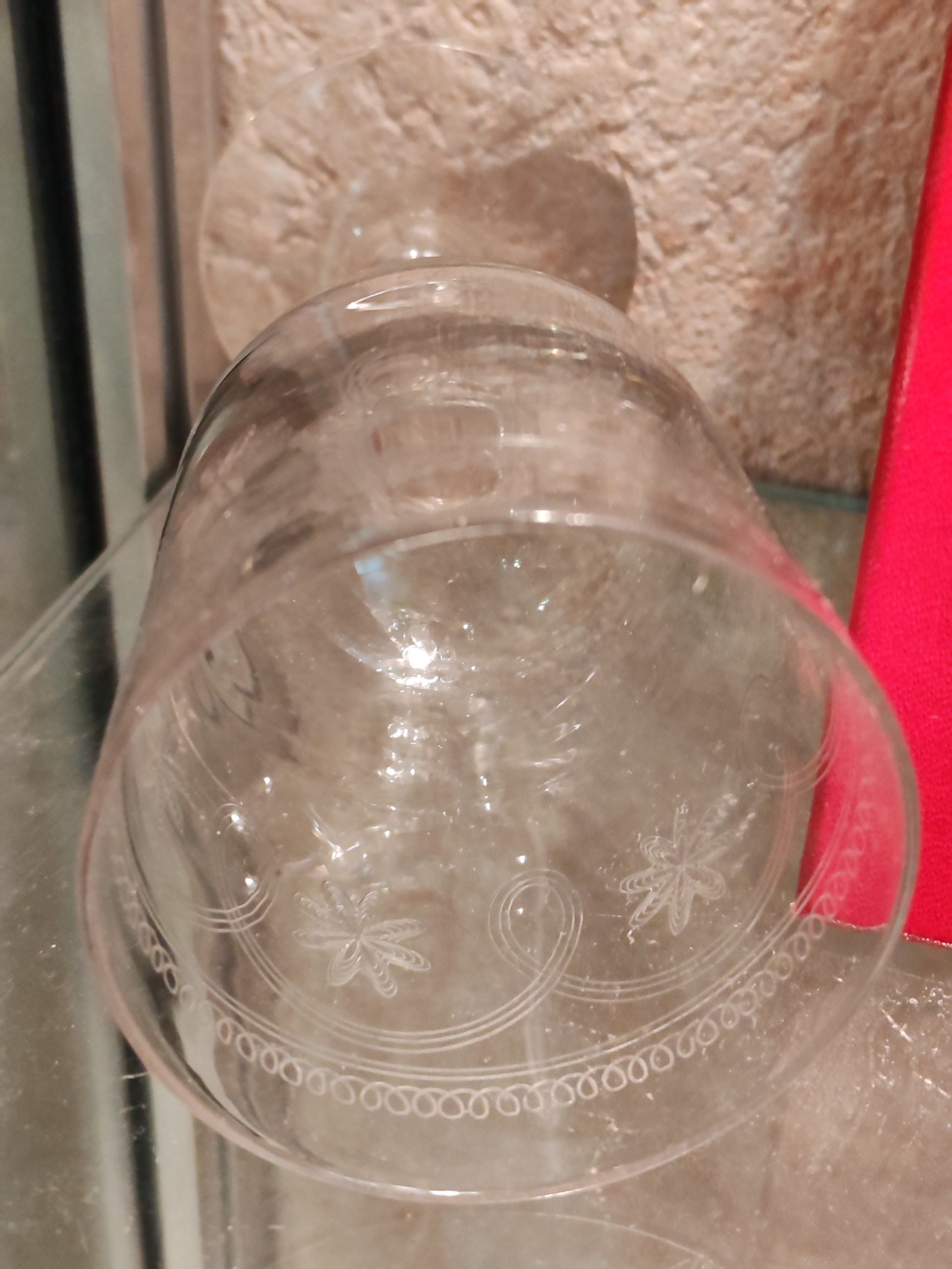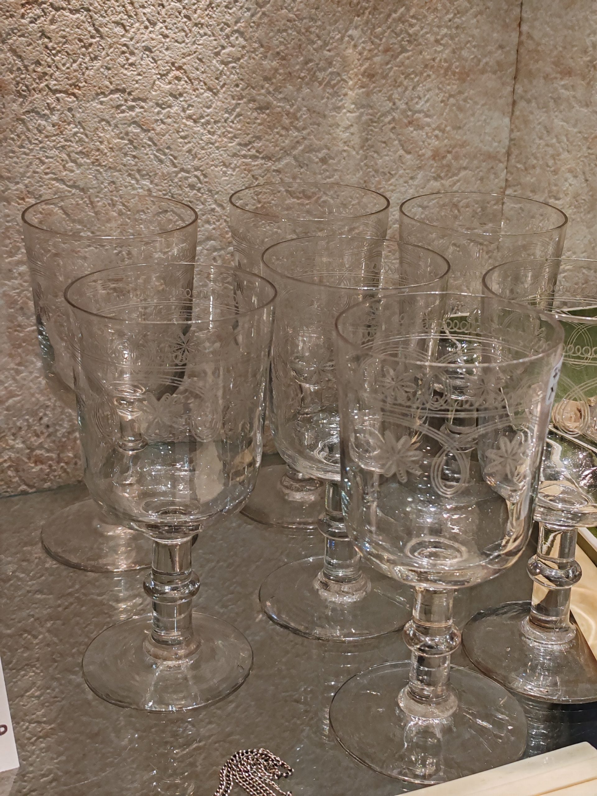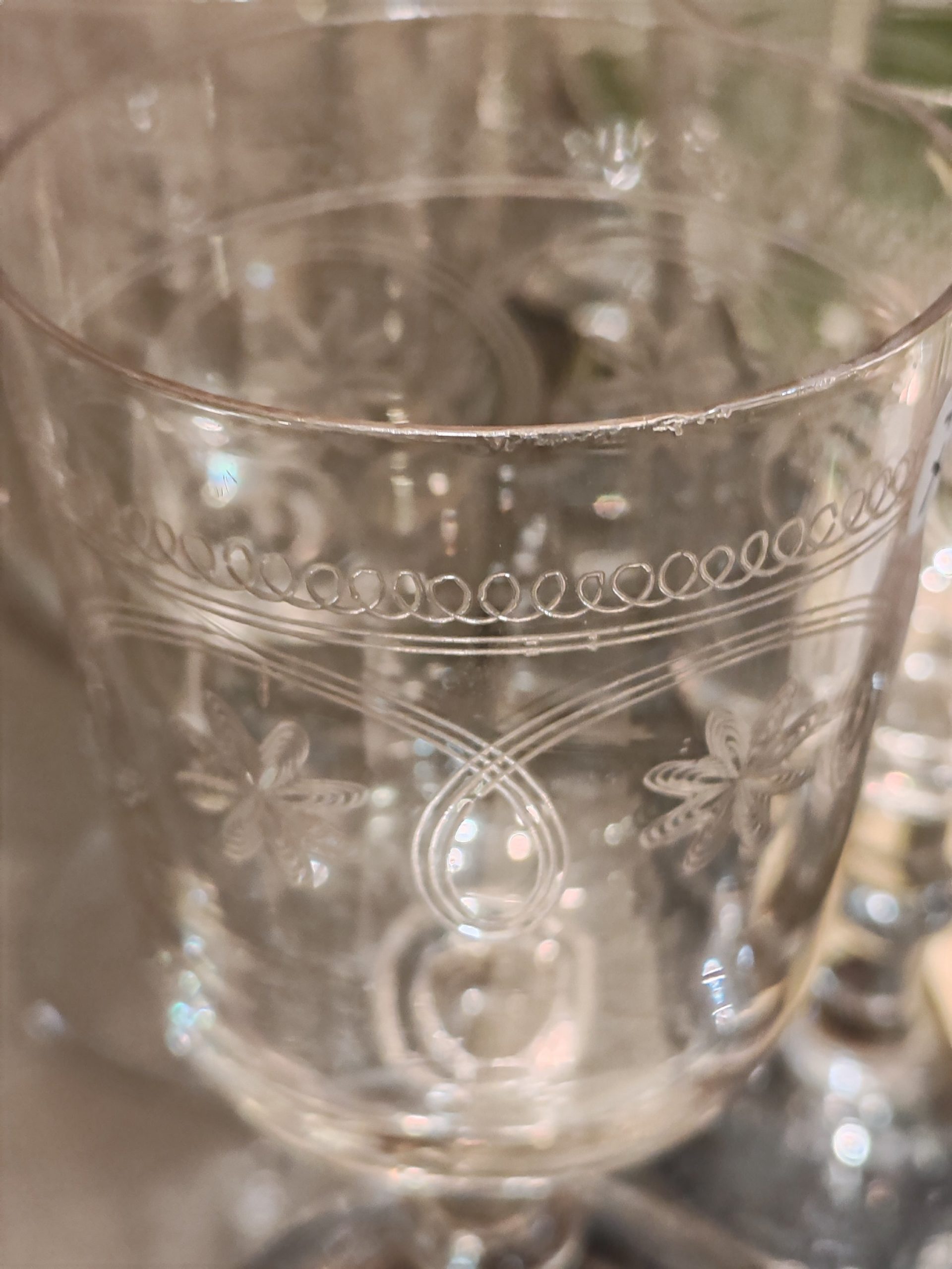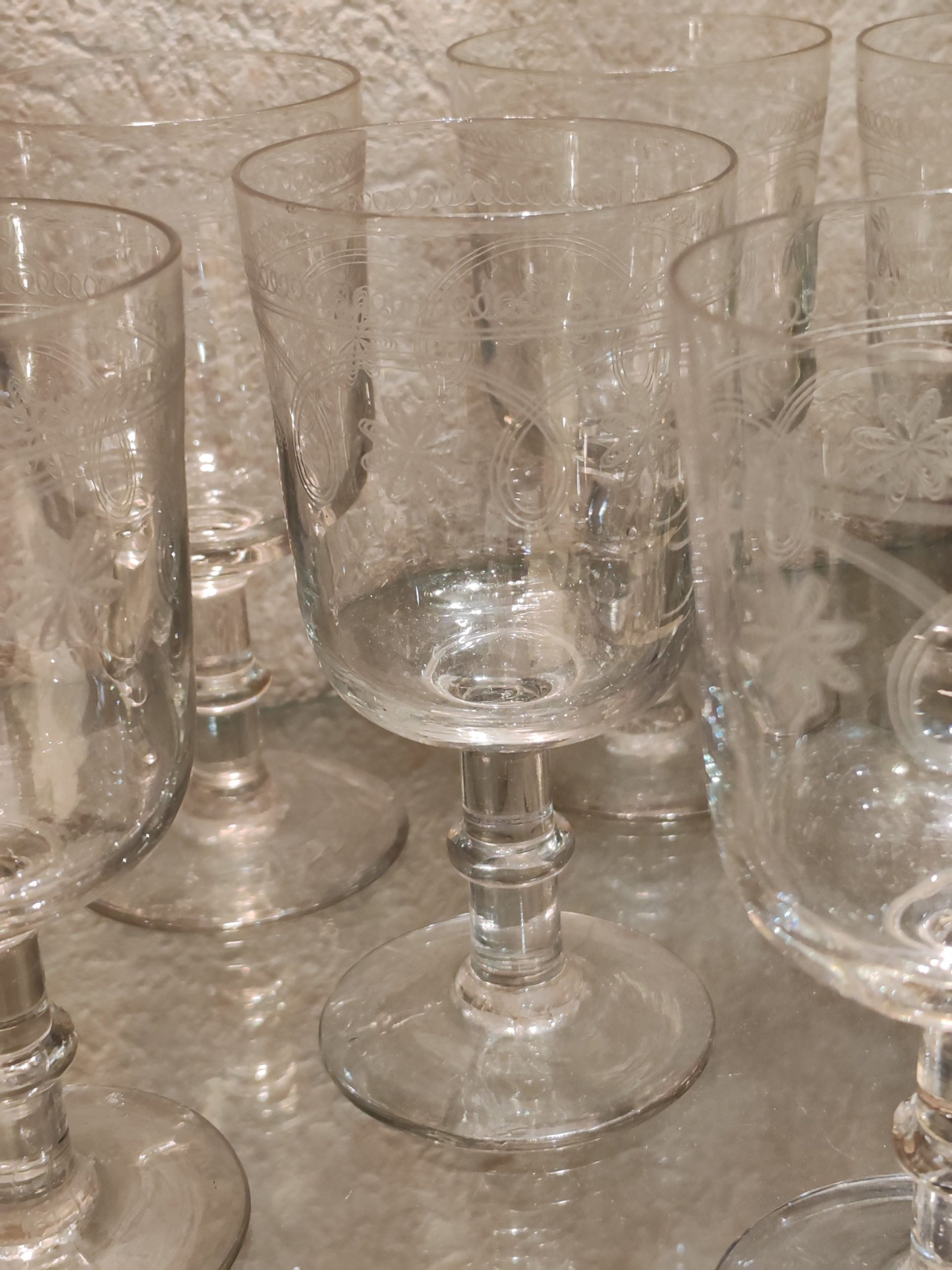 6 Verres soufflés à pied décor de roses et de feuillages , Frises à la grecque, environ 1885 XIXÈME.