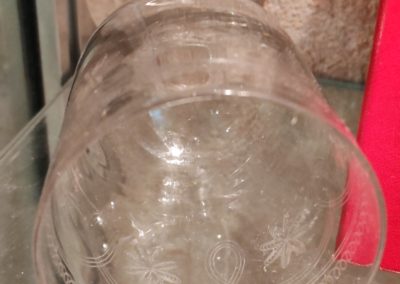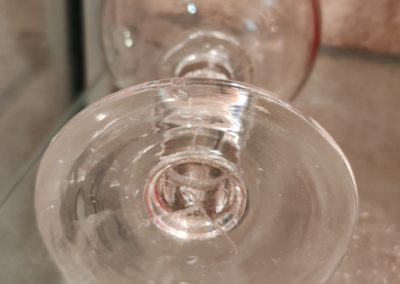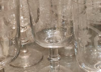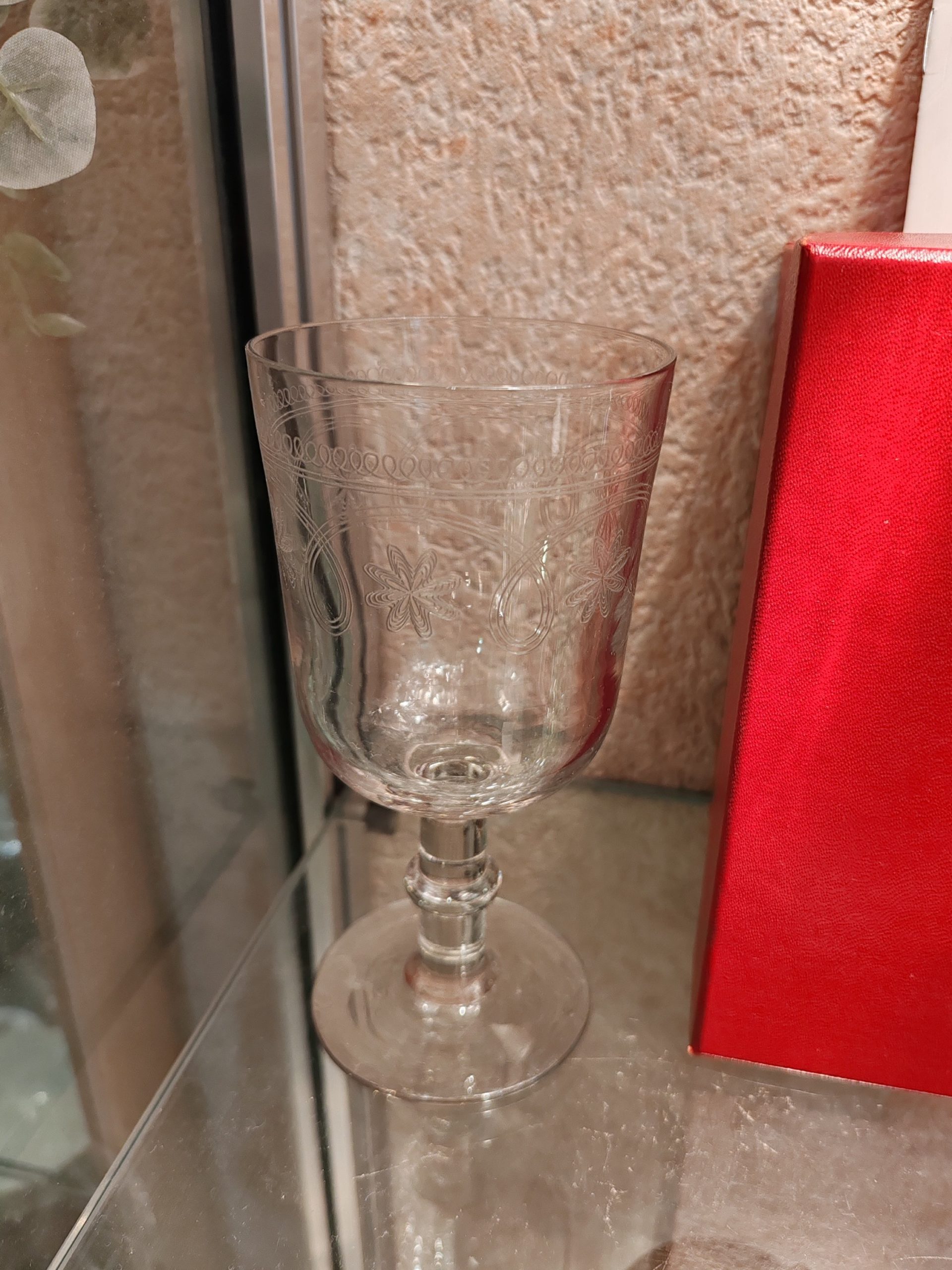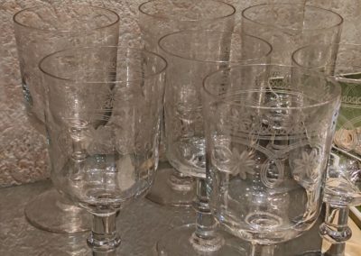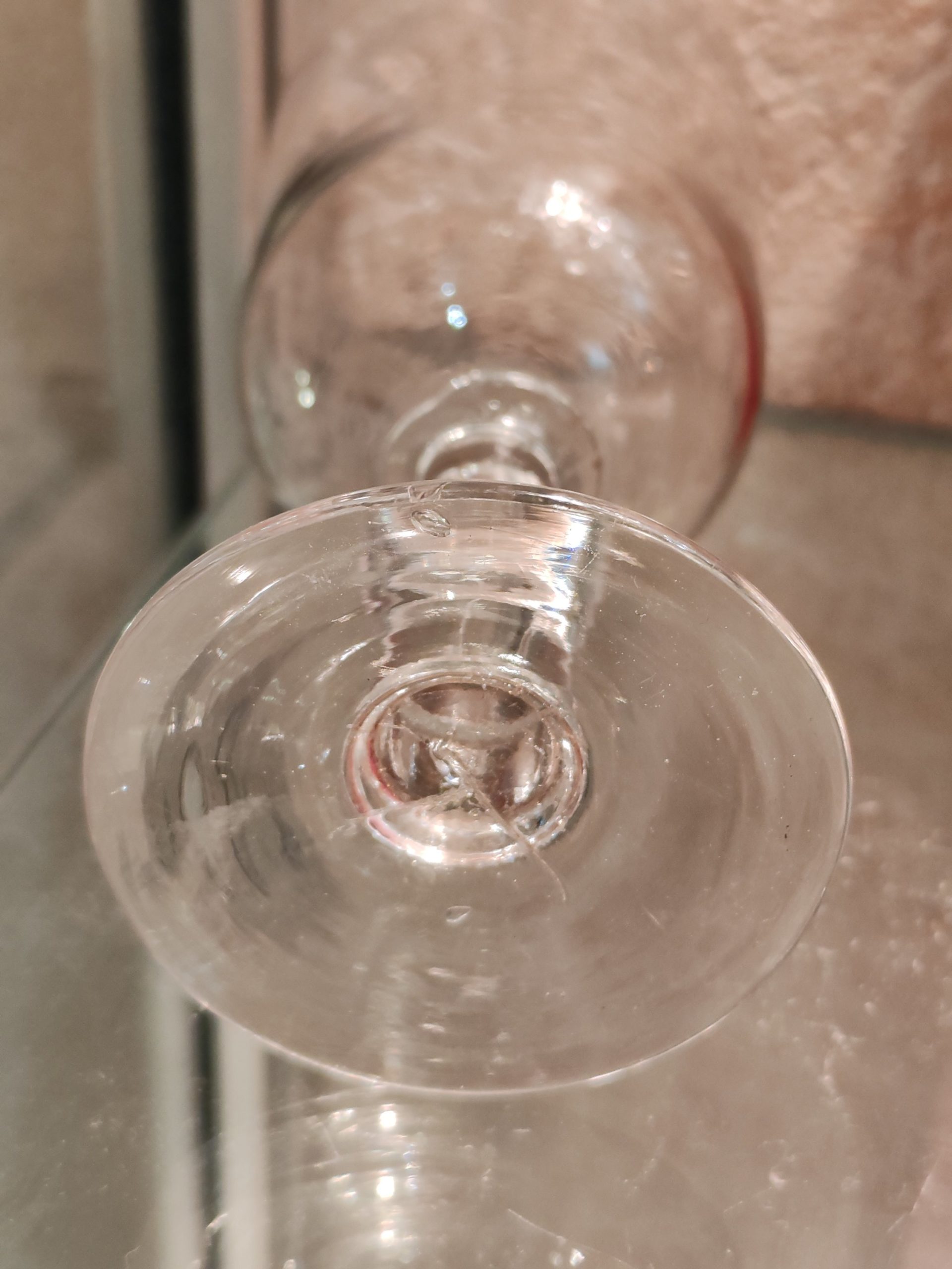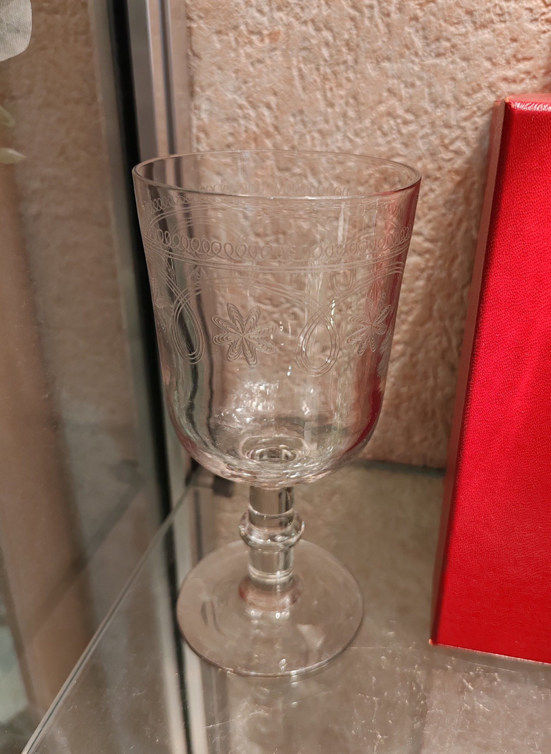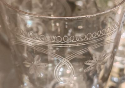 6 Verres soufflés à pied décor de roses et de feuillages , Frises à la grecque, environ 1885 XIXÈME.