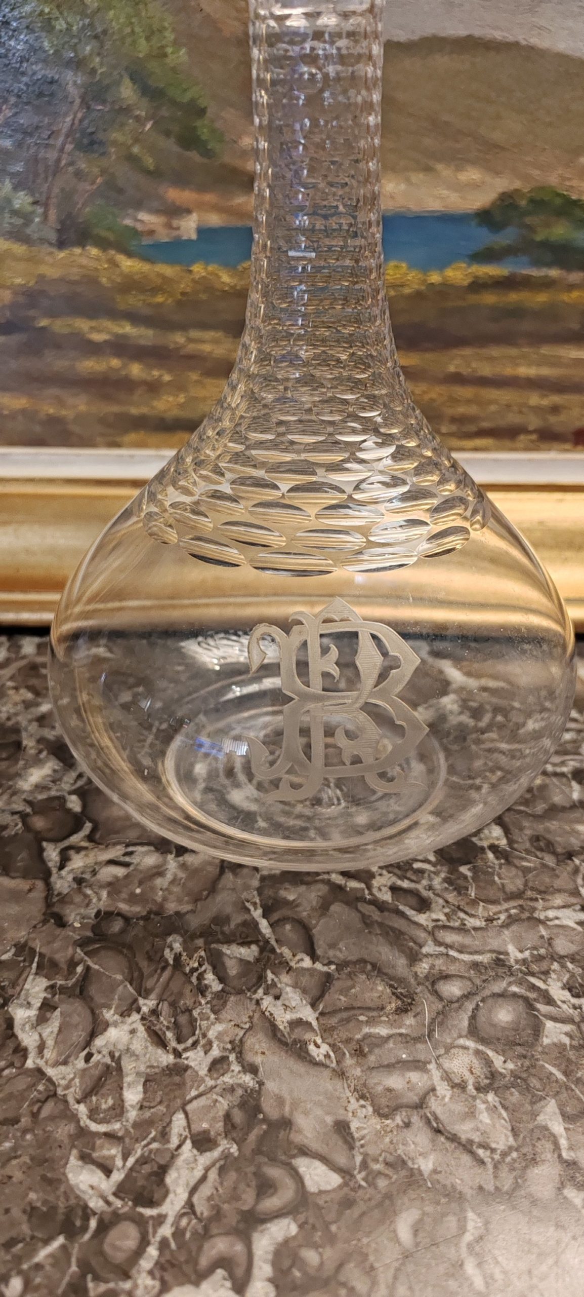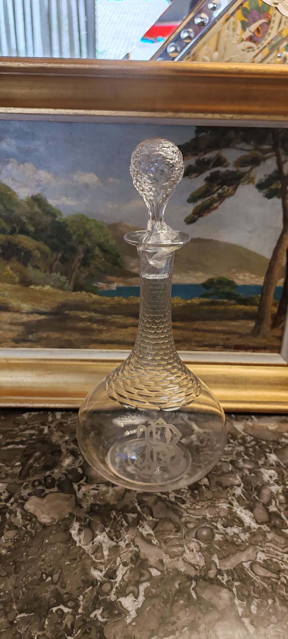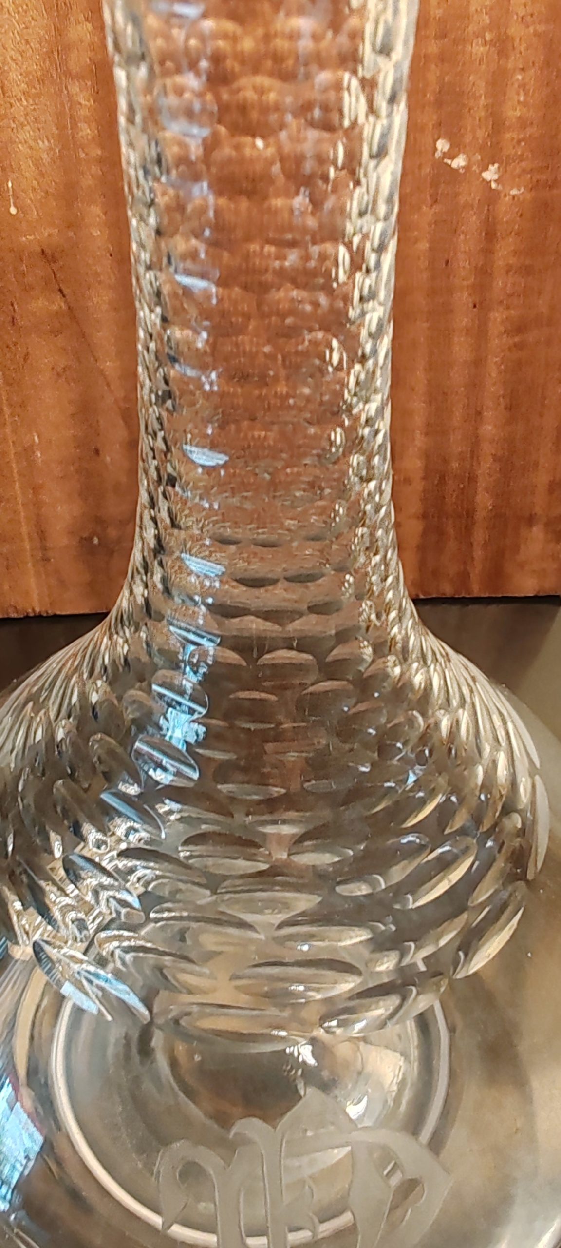 Carafe XIXÈME Val St Lambert en Cristal. Celle-ci est Taillée le long du col et sur le bouchon ornée d’un monogramme. Hauteur 20cm