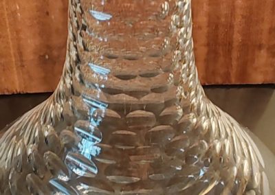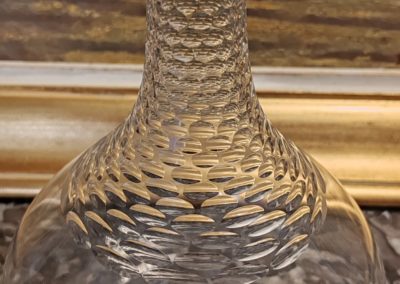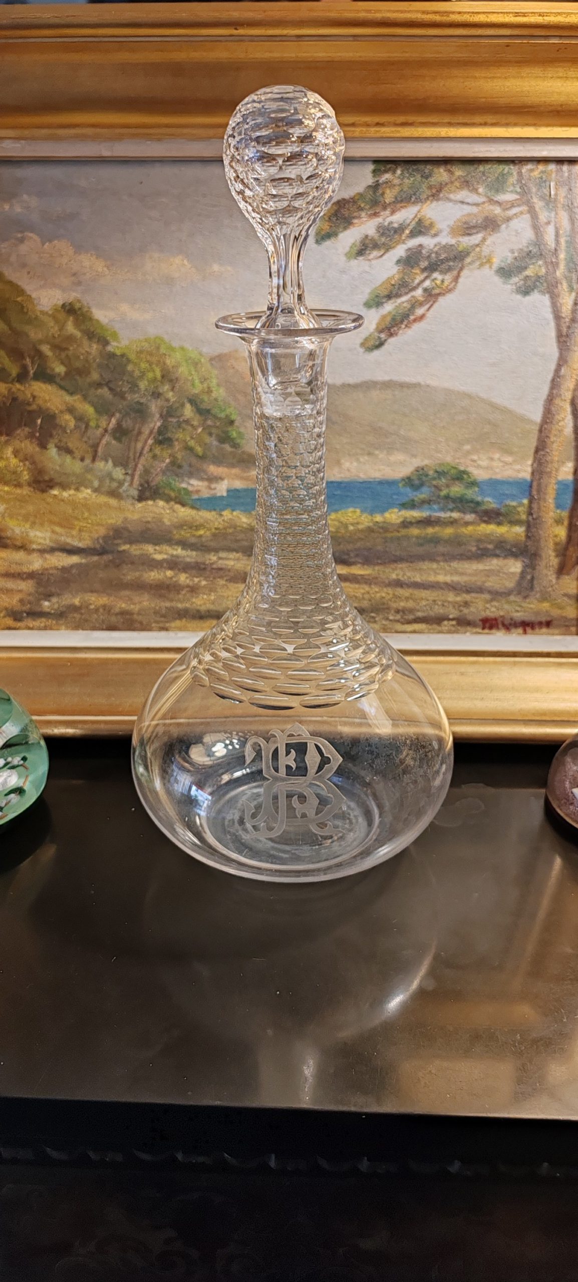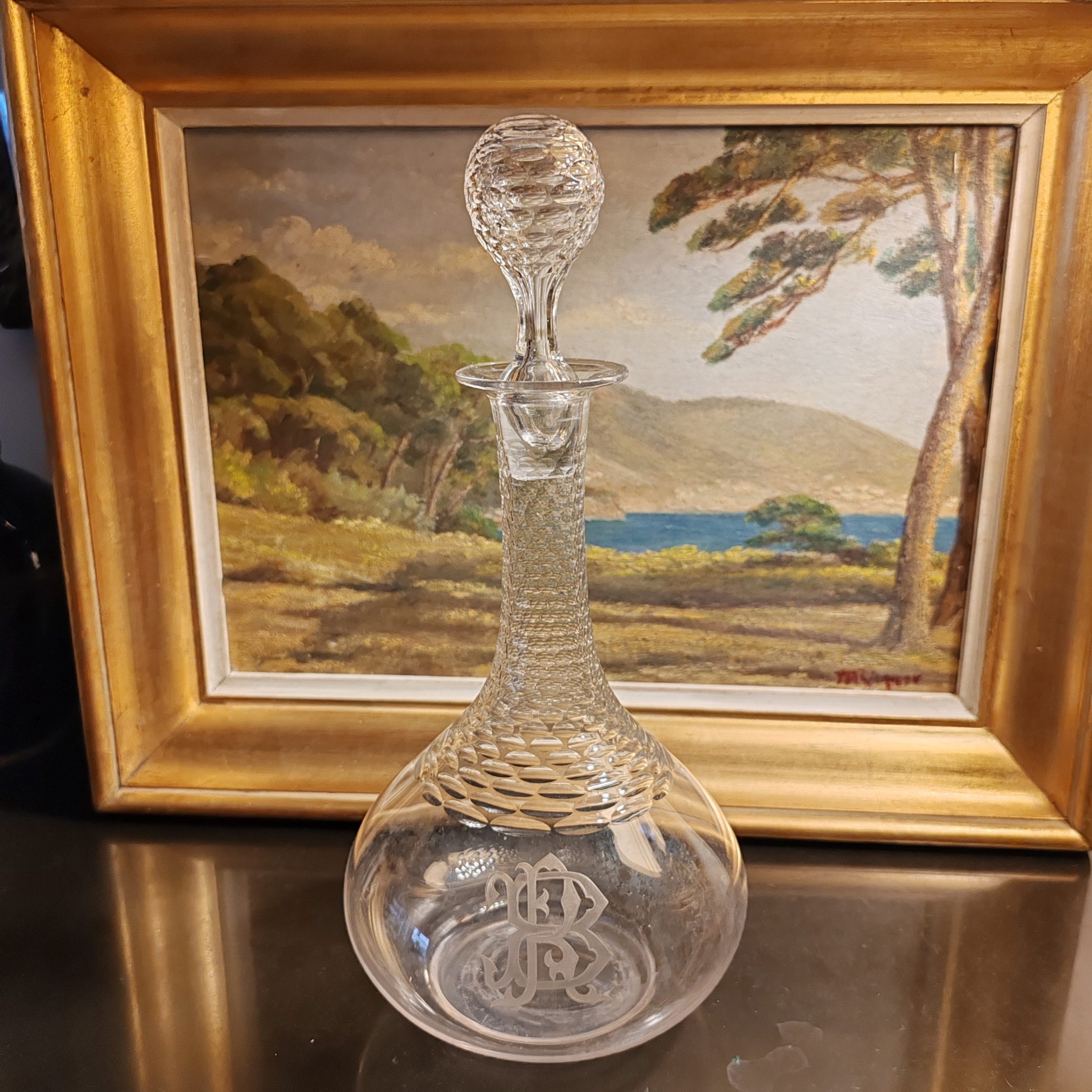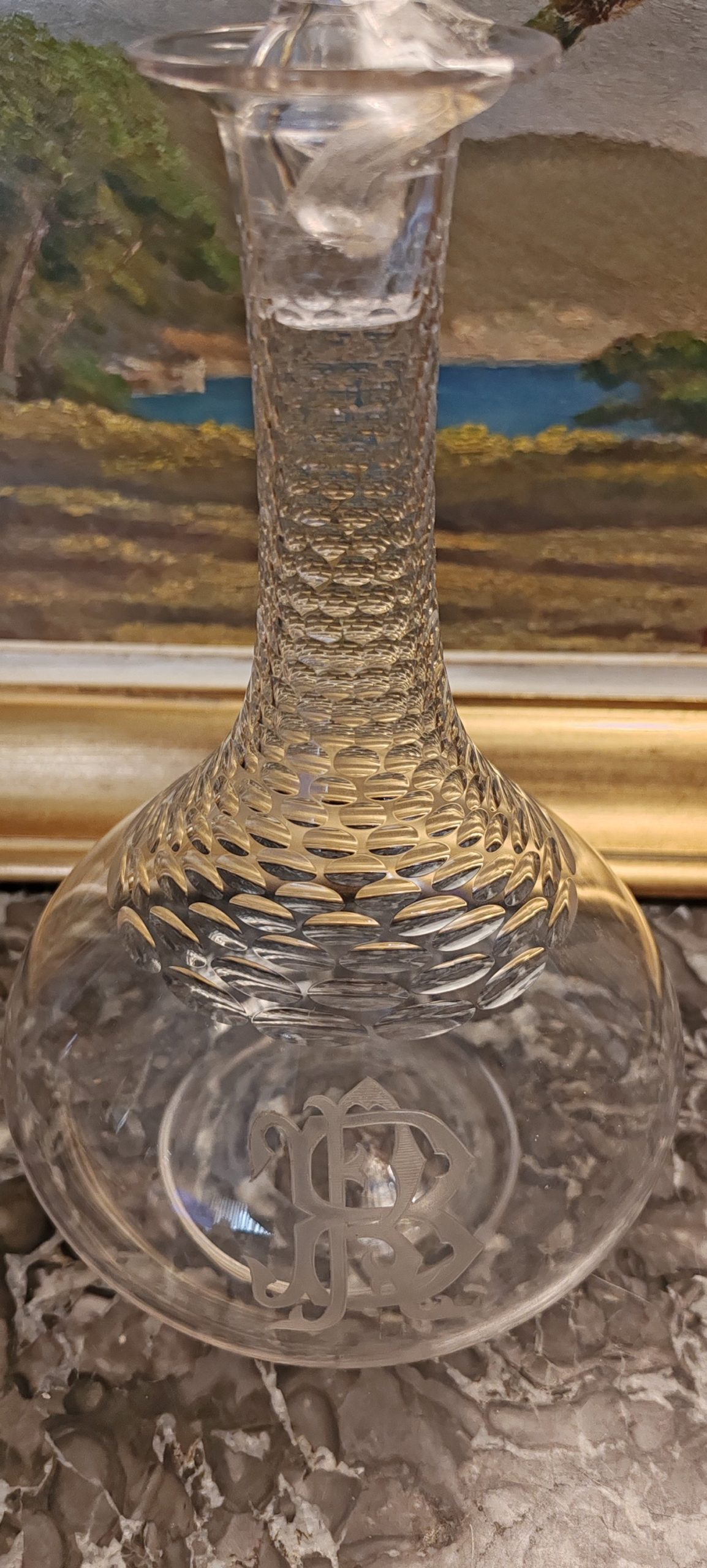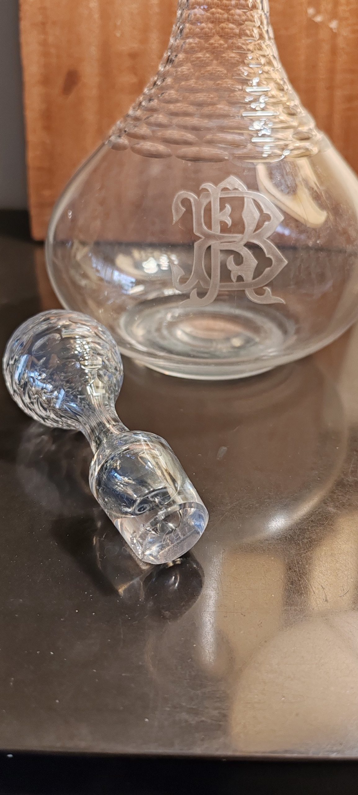 Carafe à vin en cristal taillé à décor « écailles de poisson » par Val Saint Lambert, ornée d’un monogramme. Sans signature car avant 1930. Bouchon d’origine, rodé et numéroté . Élégante et ancienne, elle est parfaite pour le vin et constitue une pièce maîtresse sur un chariot de bar. Cette carafe est large et peut contenir plus qu’une carafe de taille moyenne.