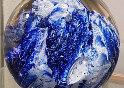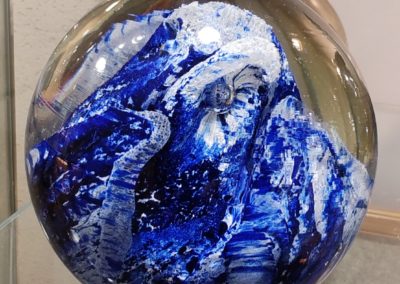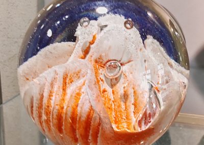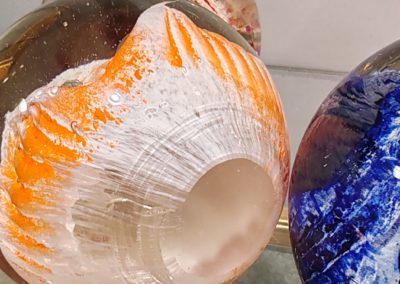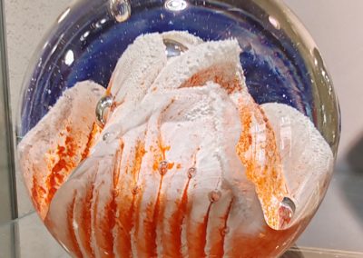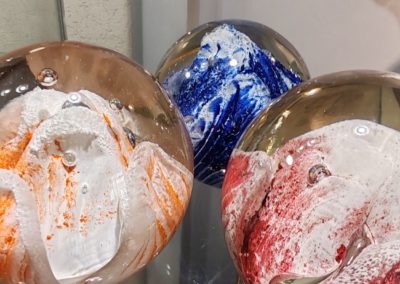3 Sulfures en Cristal fait main. Le motif situé sur le bas de chaque pièce avec pour l’un des couleurs oranges, l’autre bleues et le troisième rouges évoque avec le blanc un mouvement de vagues inintérrompues .