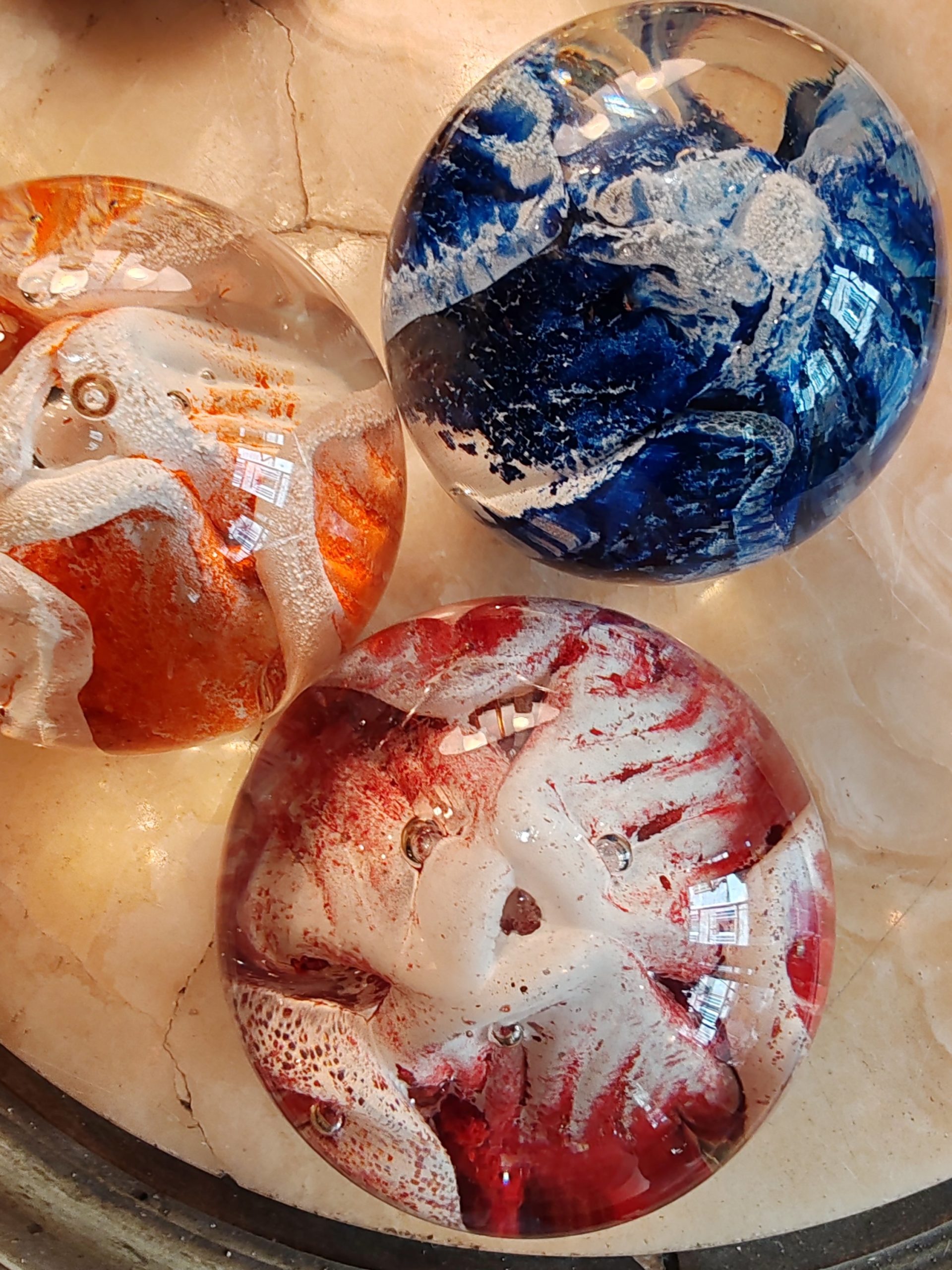 Lot de 3 Sulfures en Cristal Bleu, orange, rouge associés à du blanc en forme de vague Diamètre 6, 5 cm / 7 cm