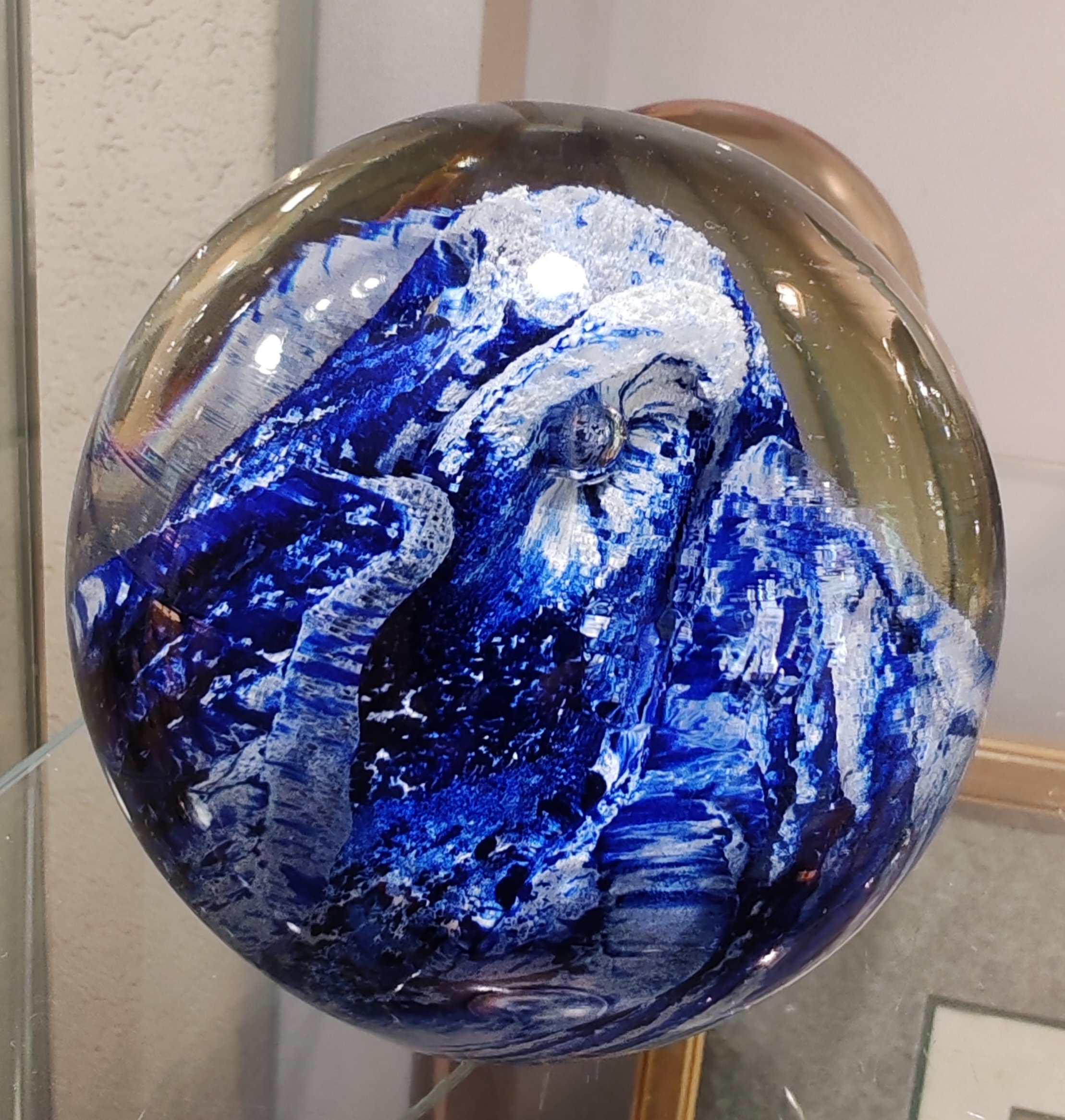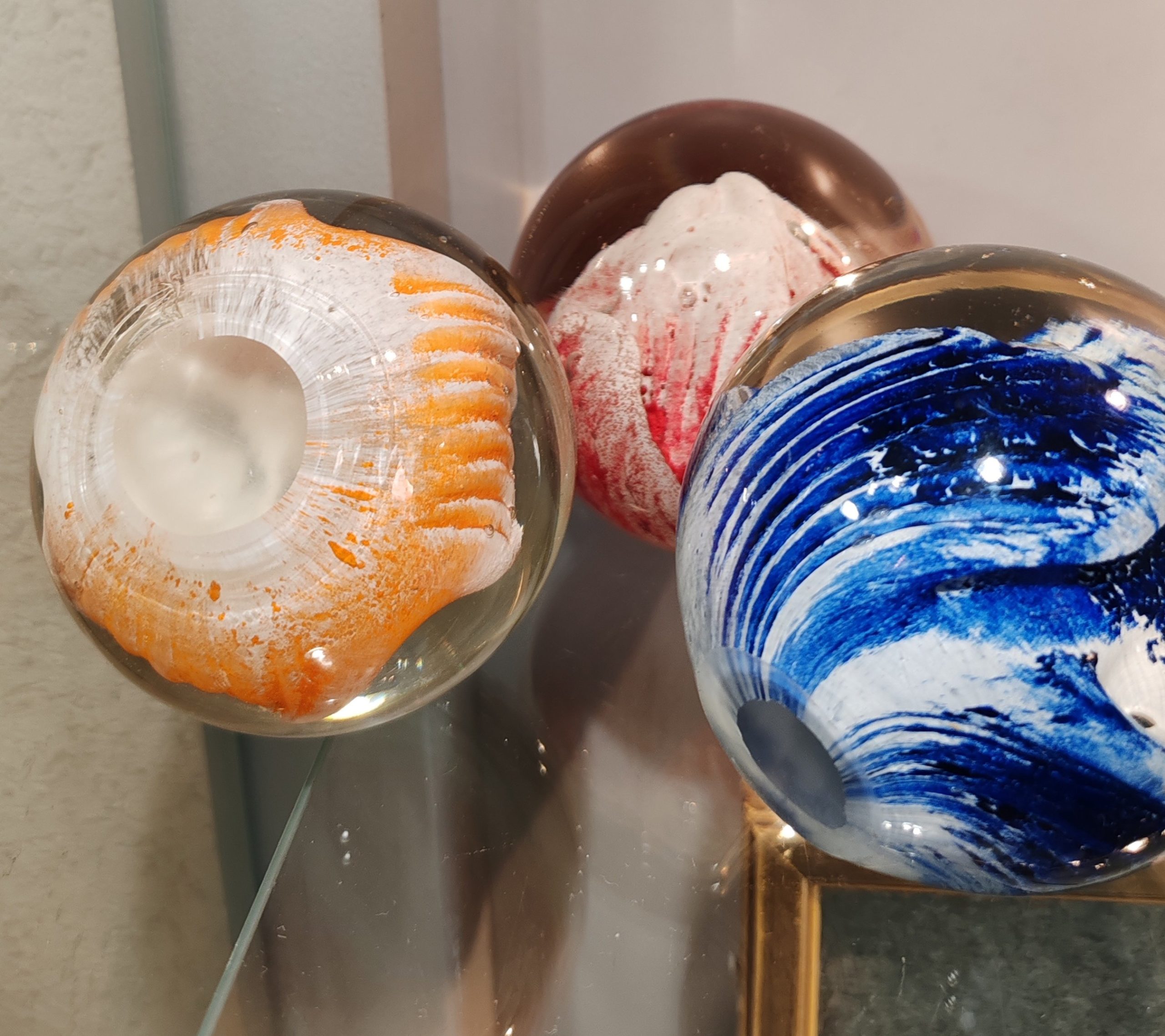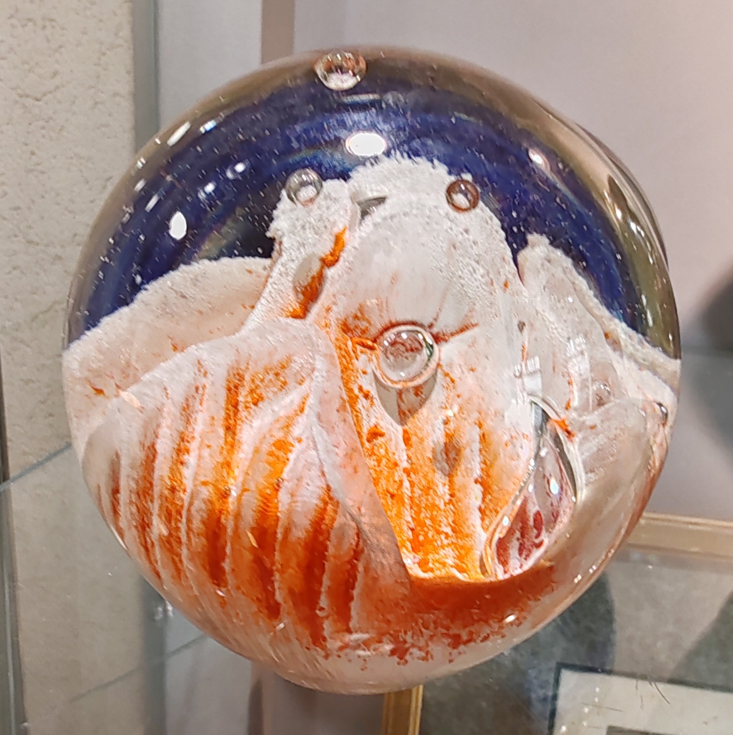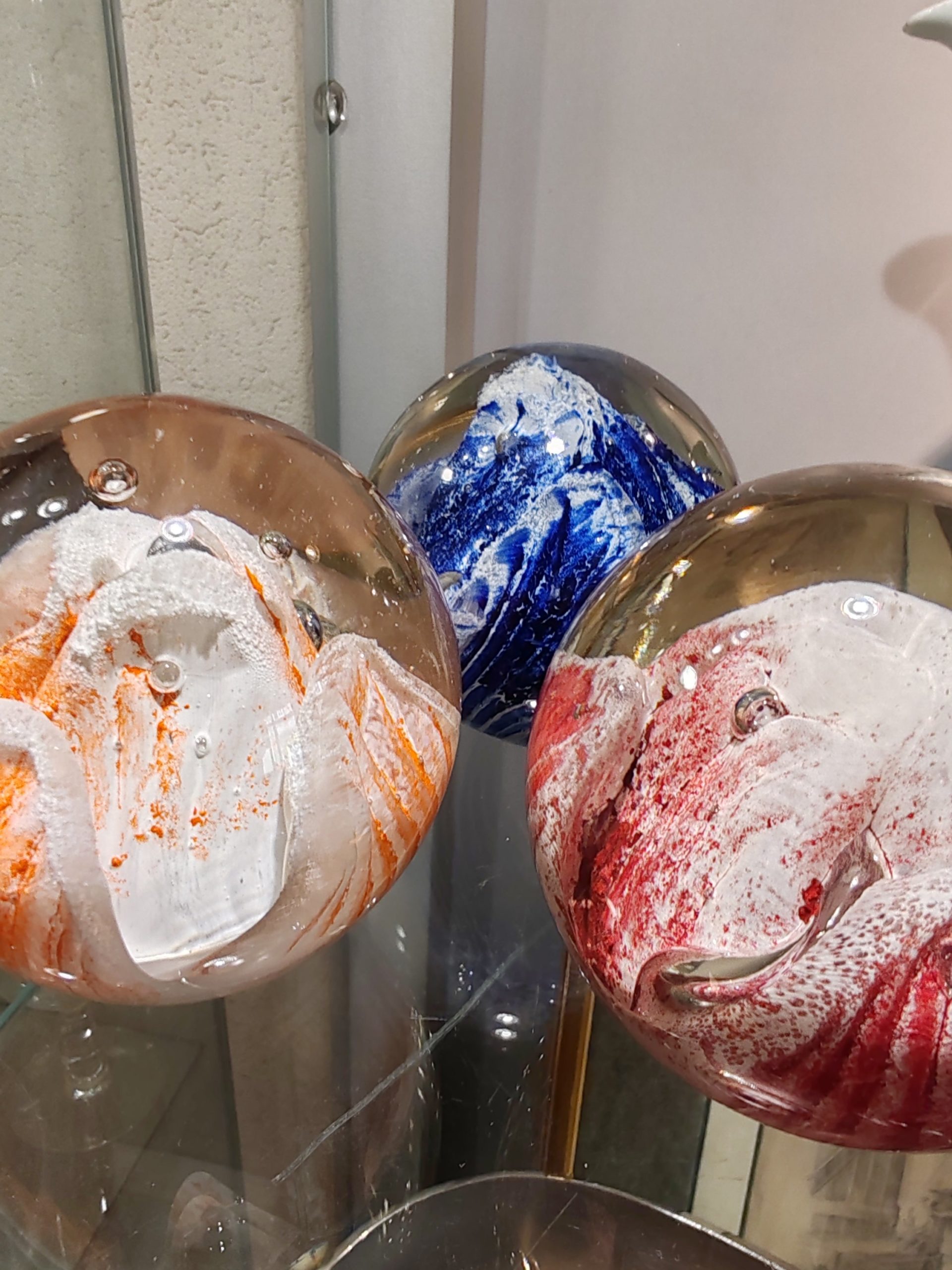 3 Sulfures en Cristal fait main. Le motif situé sur le bas de chaque pièce avec pour l’un des couleurs oranges, l’autre bleues et le troisième rouges évoque avec le blanc un mouvement de vagues inintérrompues .