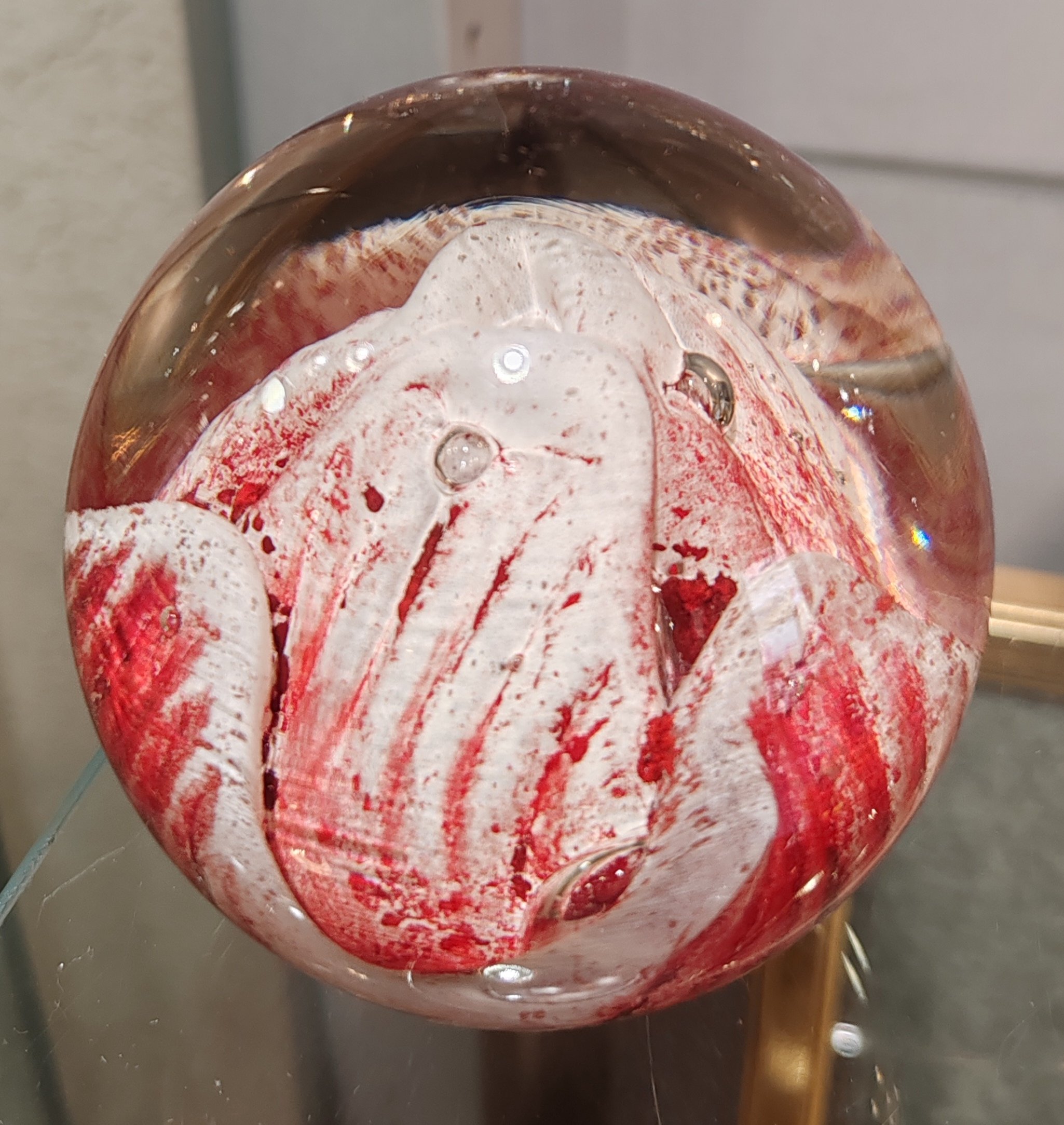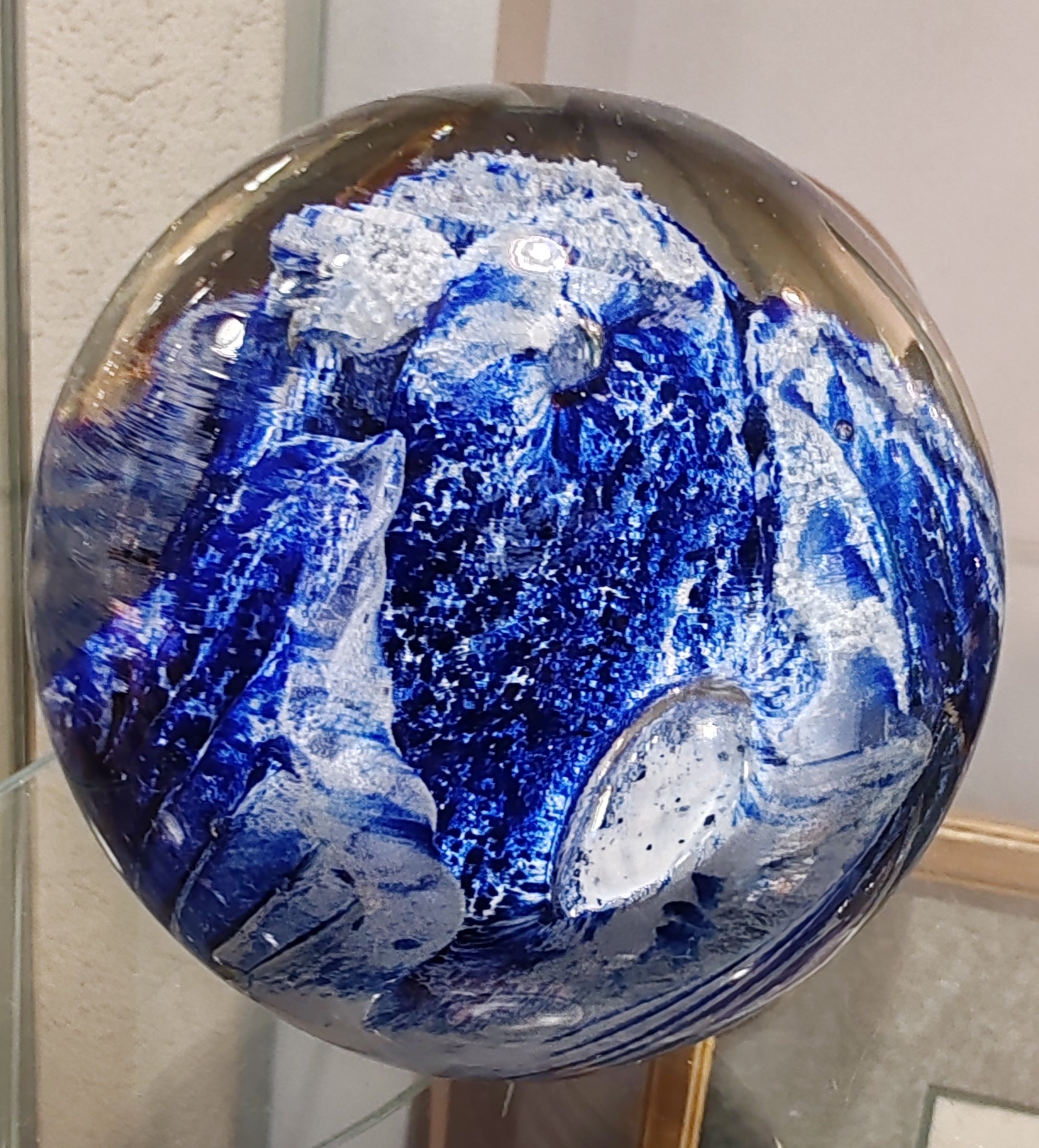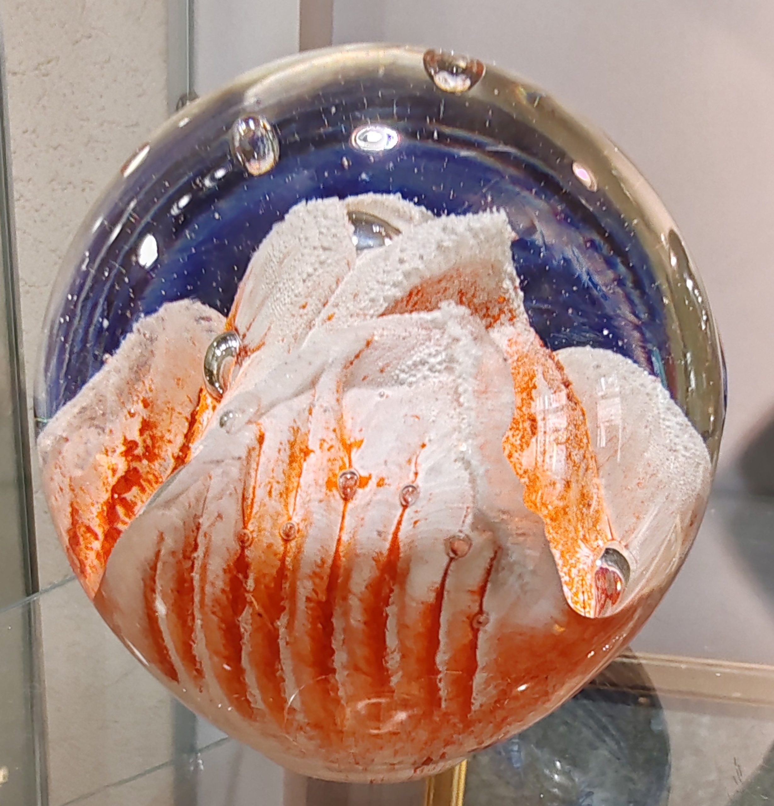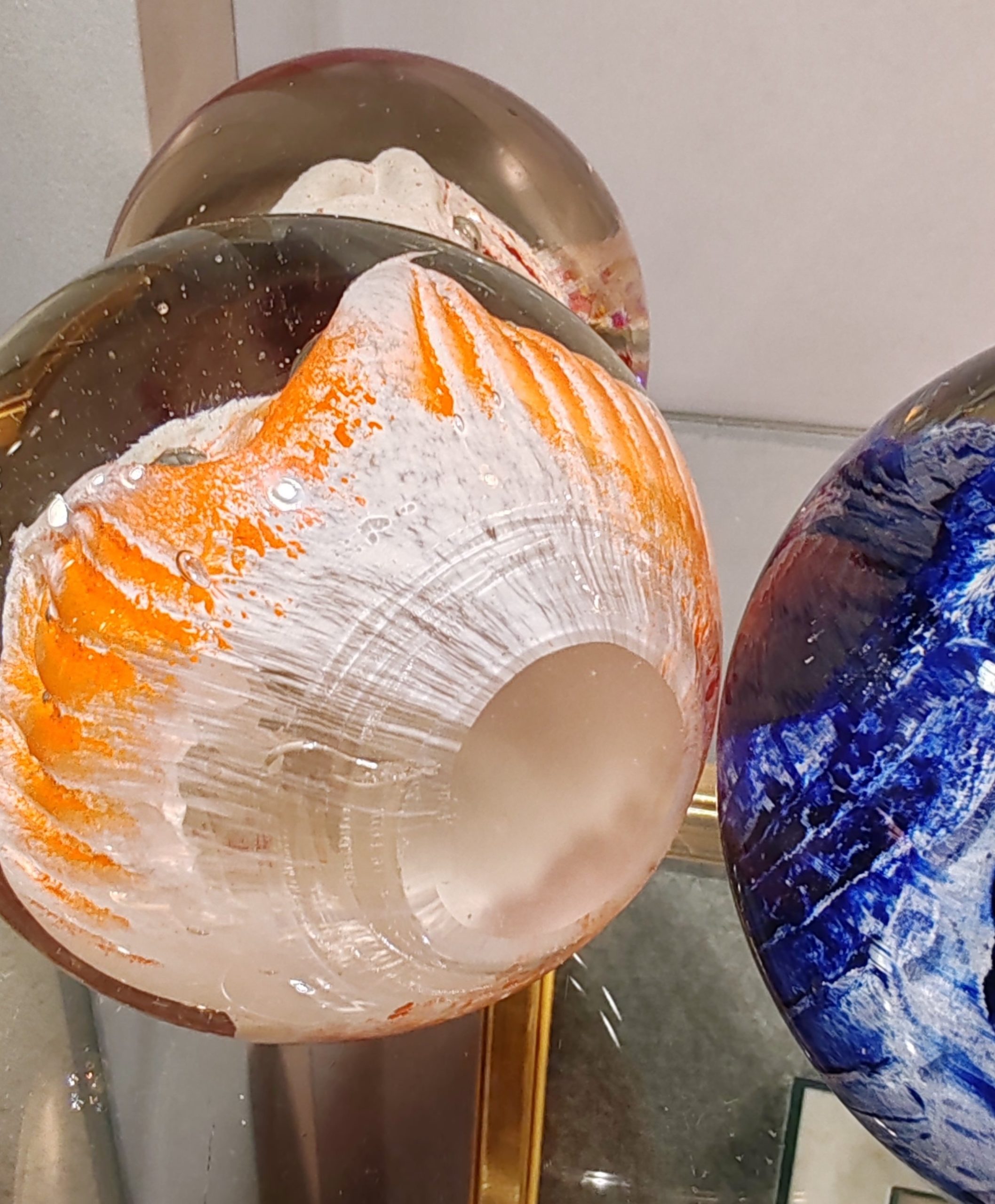 3 Sulfures en Cristal fait main. Le motif situé sur le bas de chaque pièce avec pour l’un des couleurs oranges, l’autre bleues et le troisième rouges évoque avec le blanc un mouvement de vagues inintérrompues .