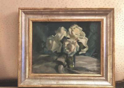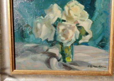 Peinture à l’huile sur panneau représentant un bouquet de roses blanches signée Charles Baudu