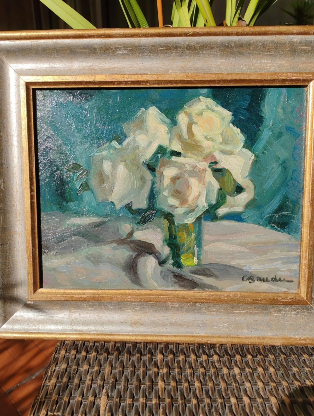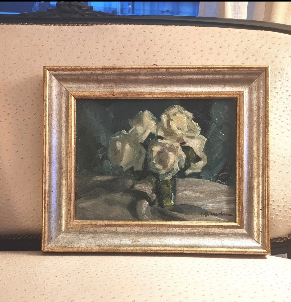 Peinture à l’huile sur panneau représentant un bouquet de roses blanches signée Charles Baudu