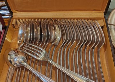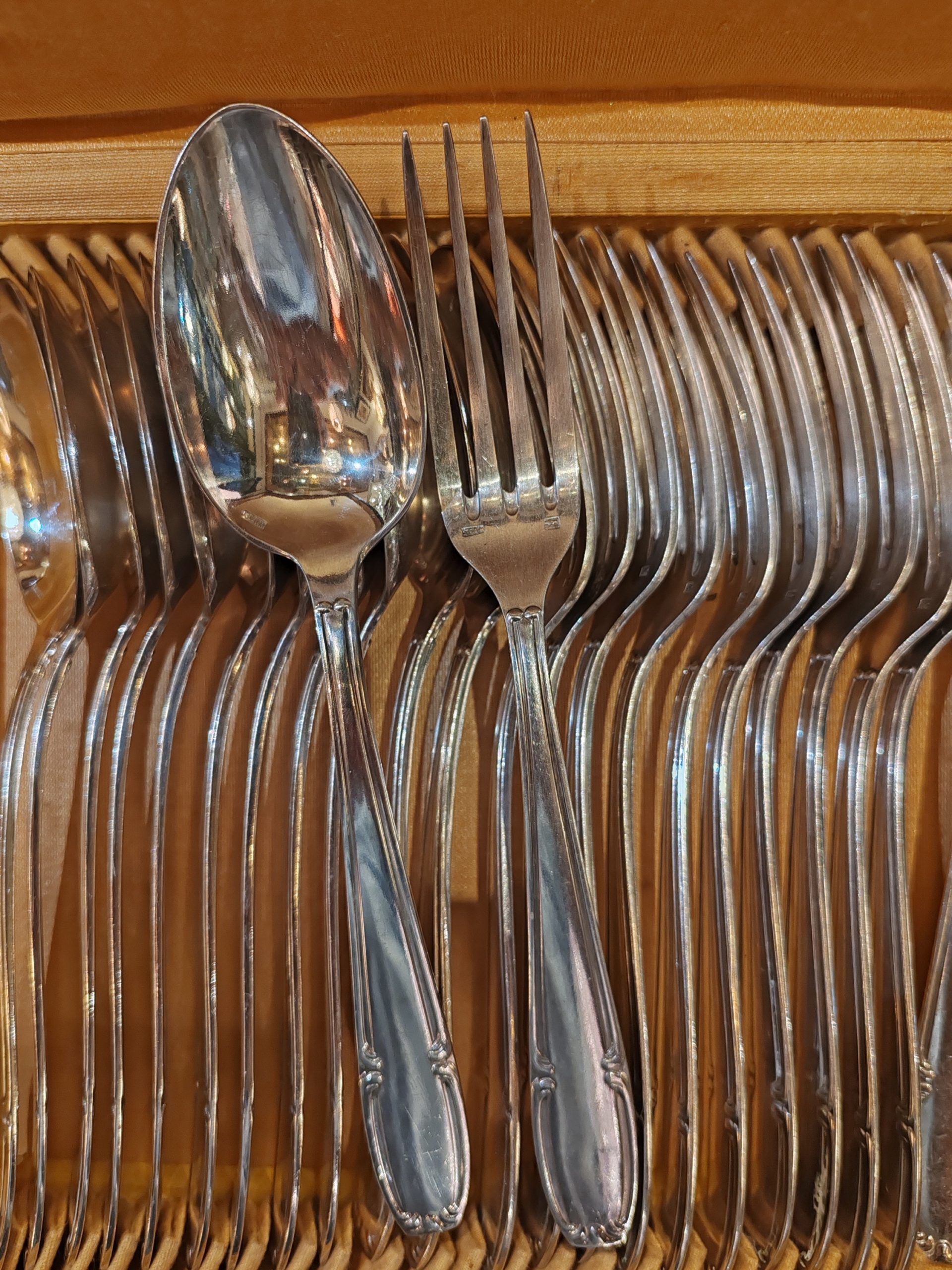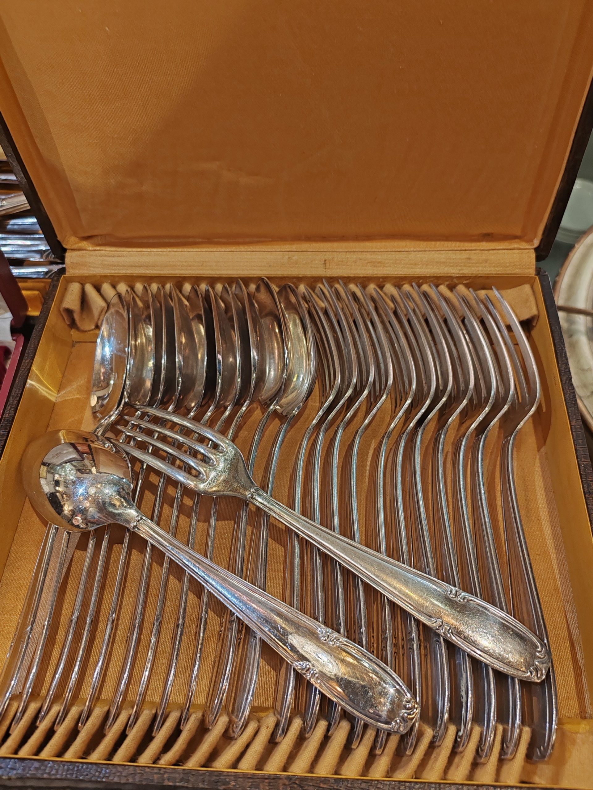 12 Fourchettes et 12 Cuillères en Métal Argenté dans leur écrin, quantité 24. Couverts de Table.