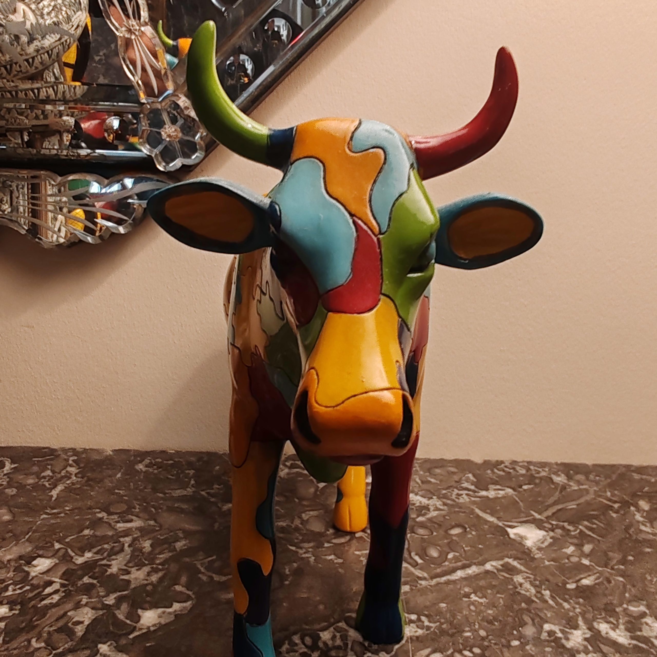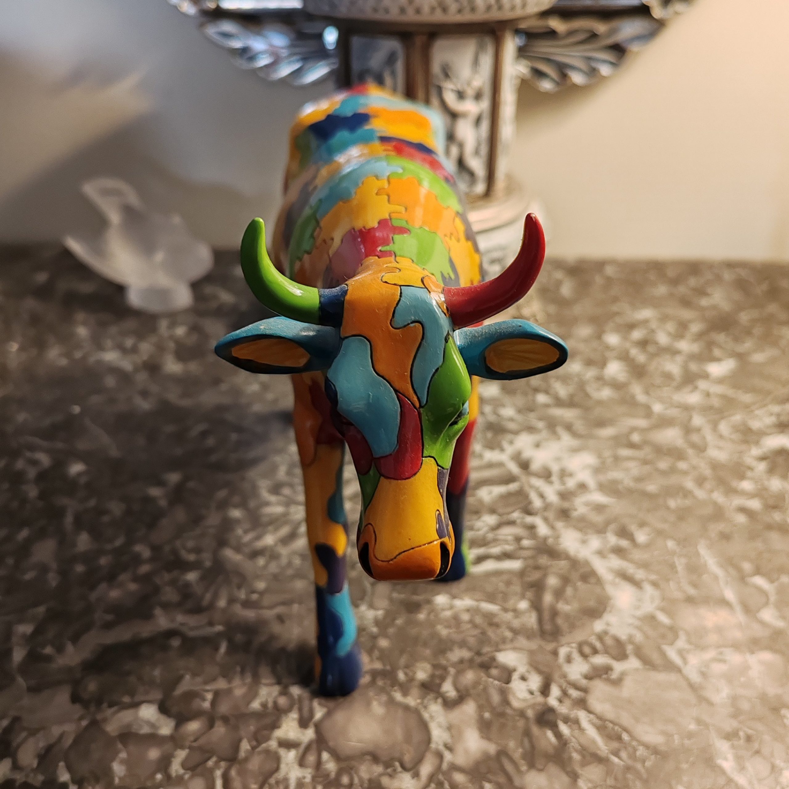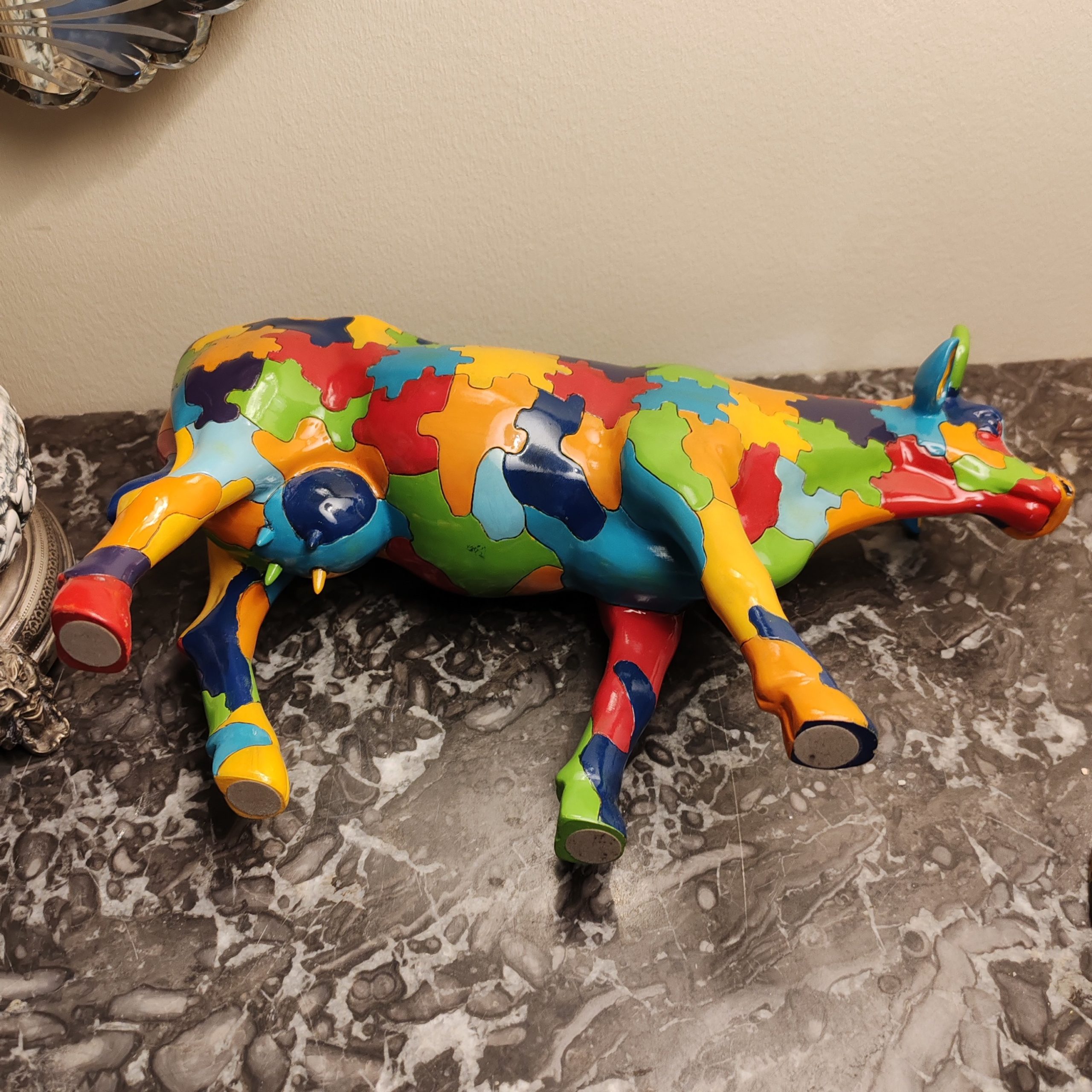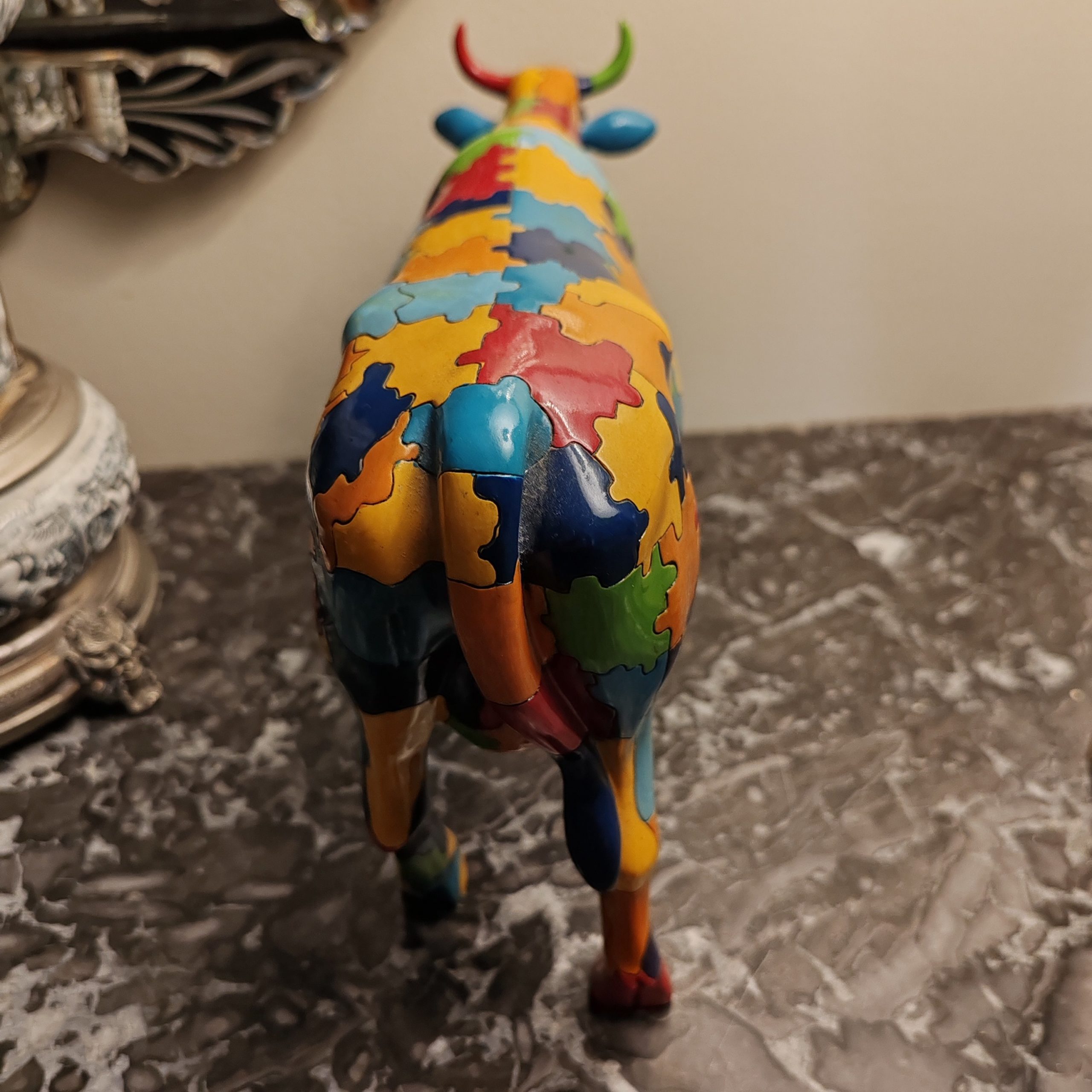 Vache COW PARADE « puzzling cow » POP ART Année 2002 signée, Peinte à la main. Longueur 30cm Designer Marcel Wanders