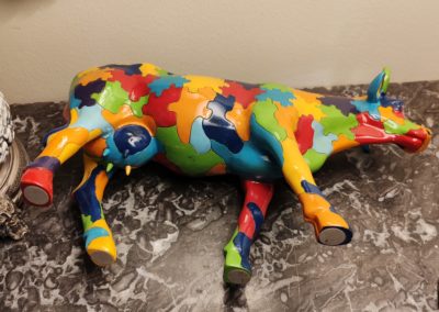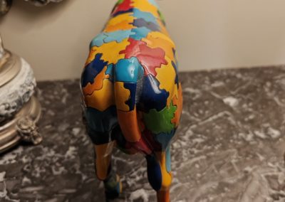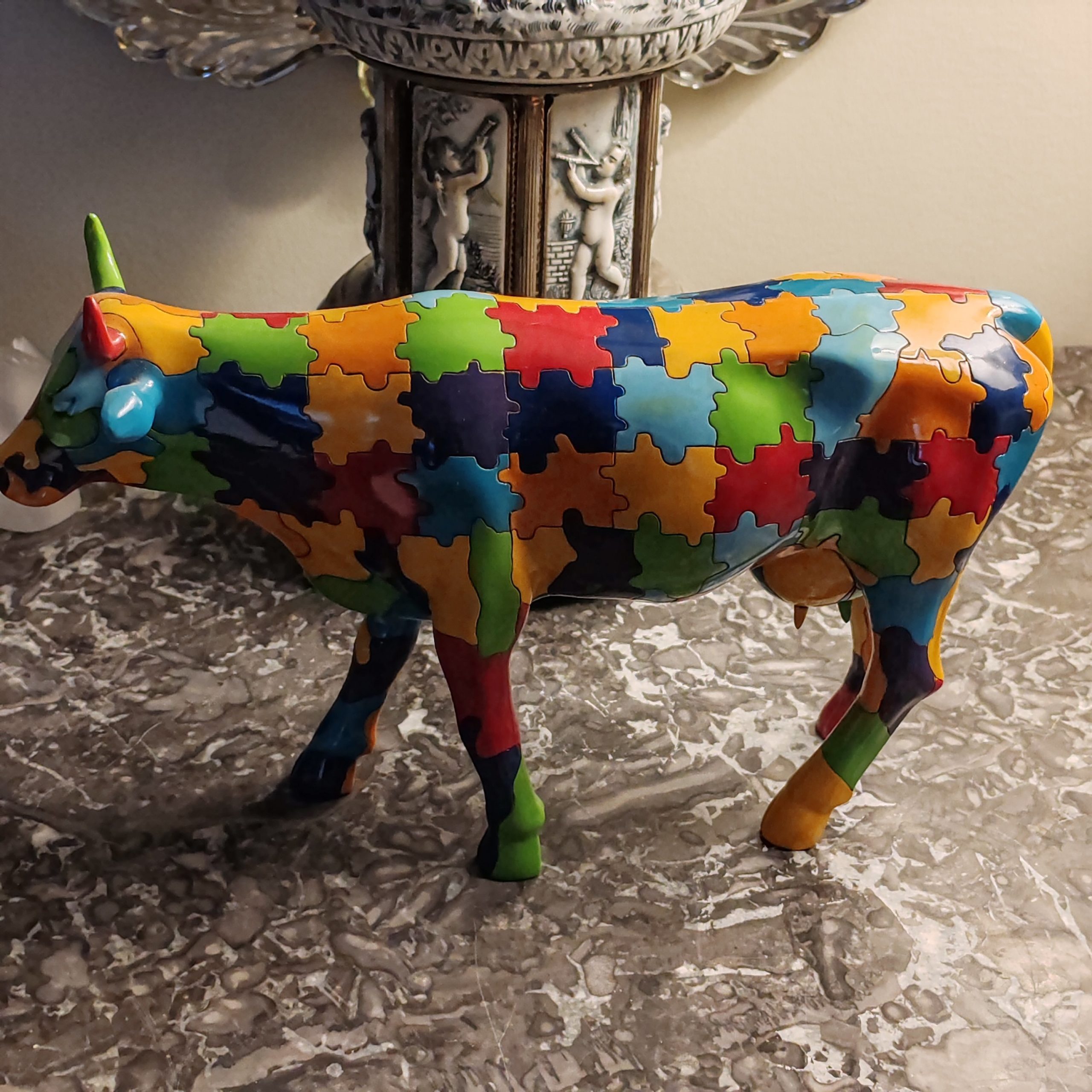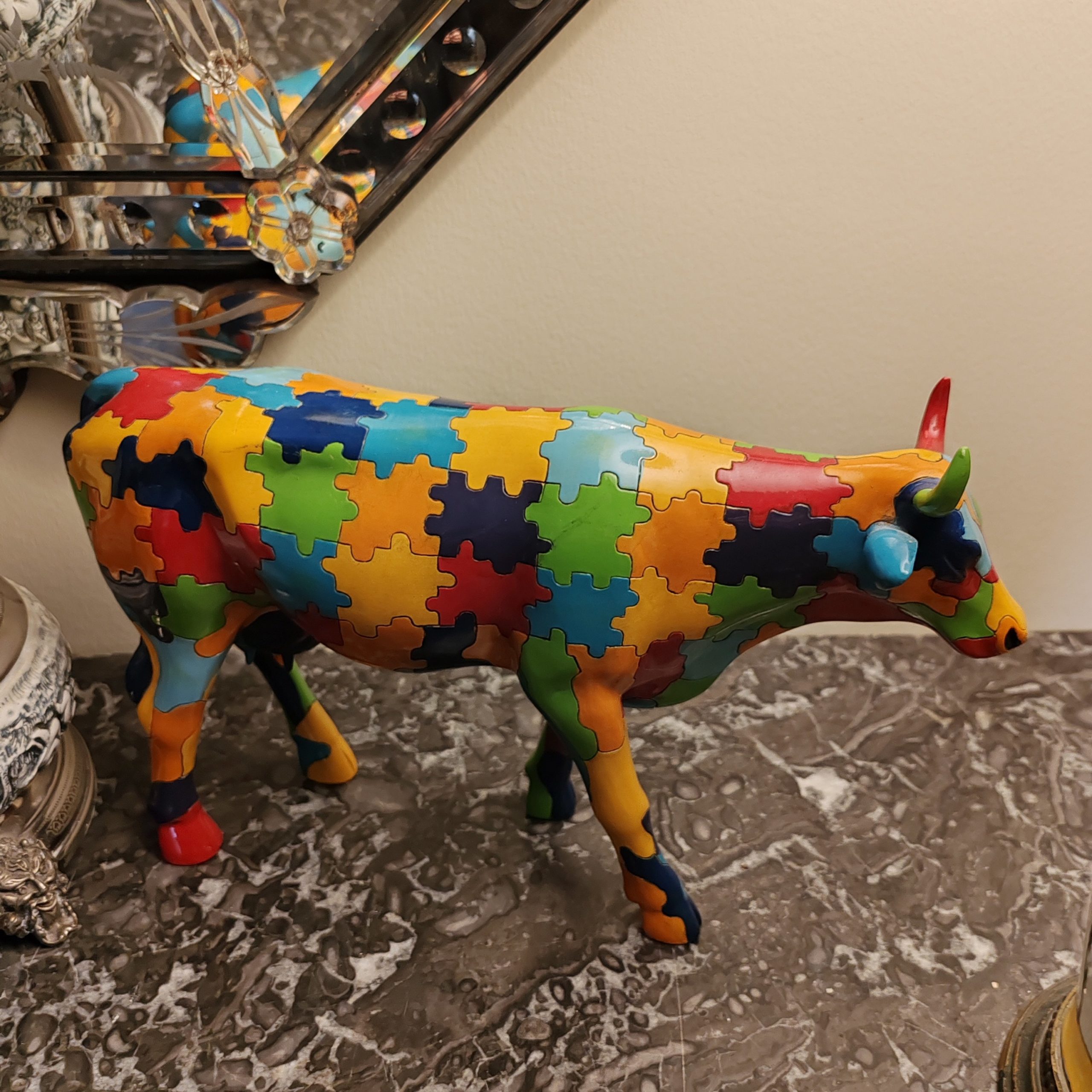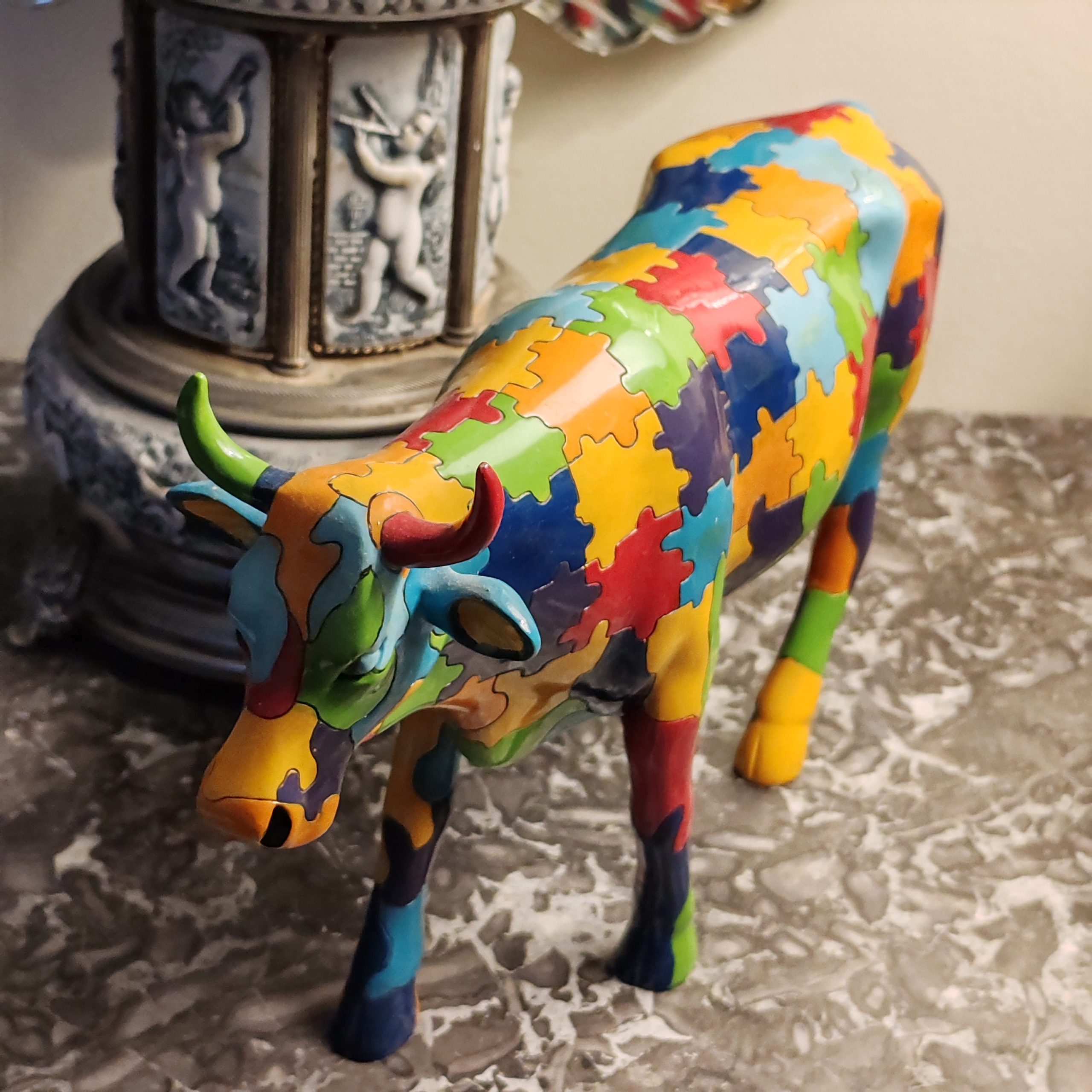 Vache COW PARADE « puzzling cow » POP ART Année 2002 signée, Peinte à la main. Longueur 30cm Designer Marcel Wanders