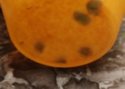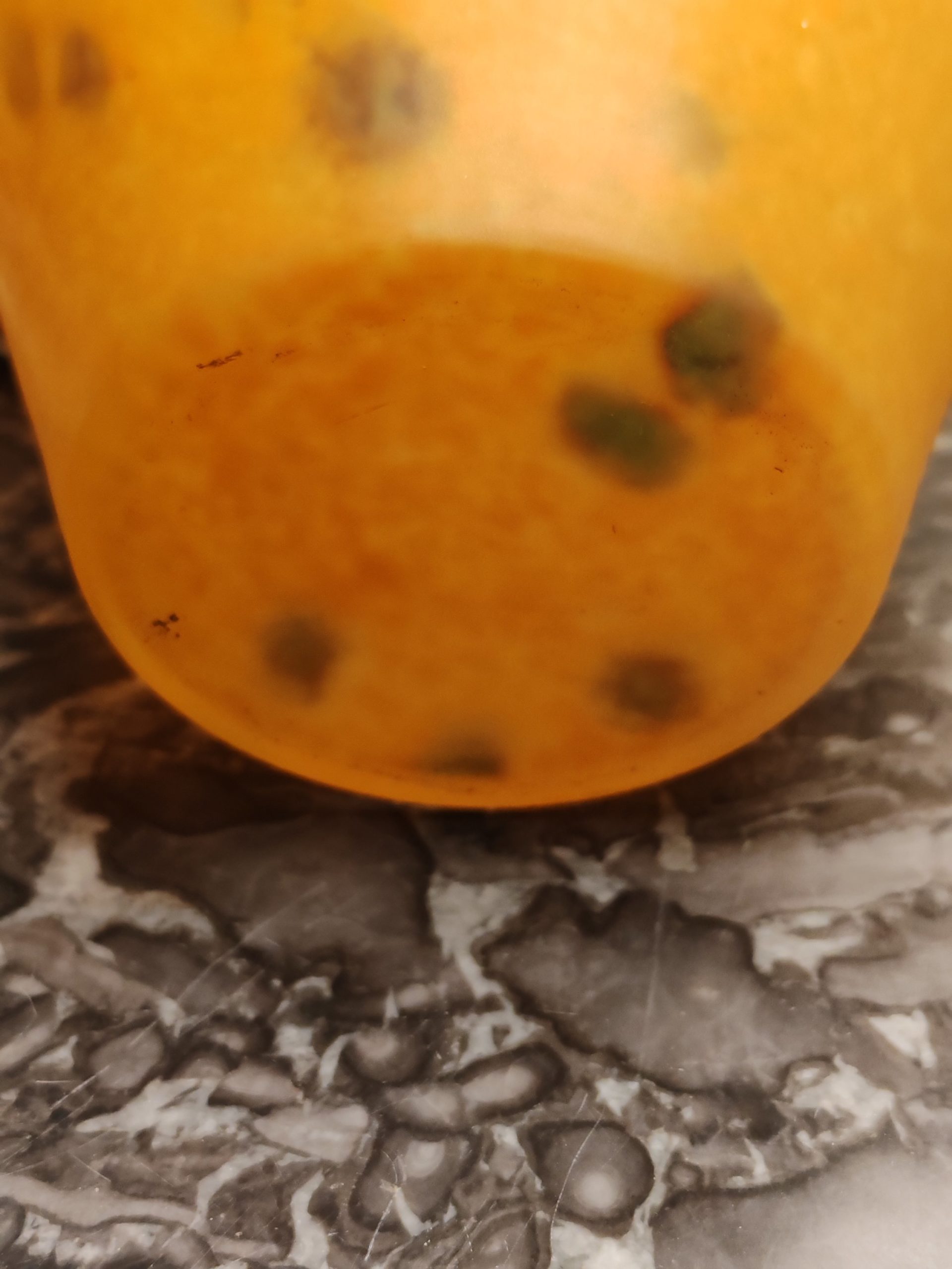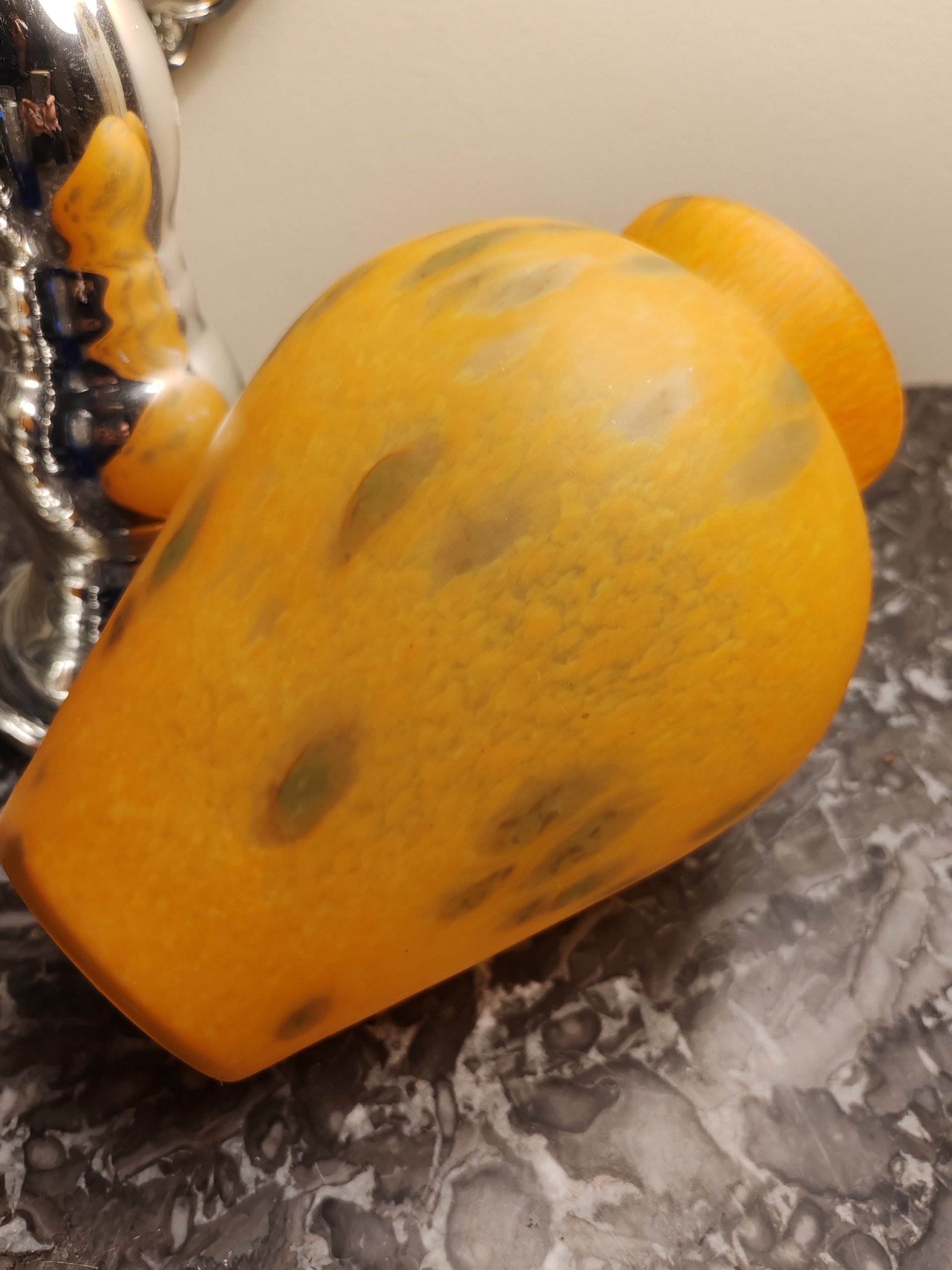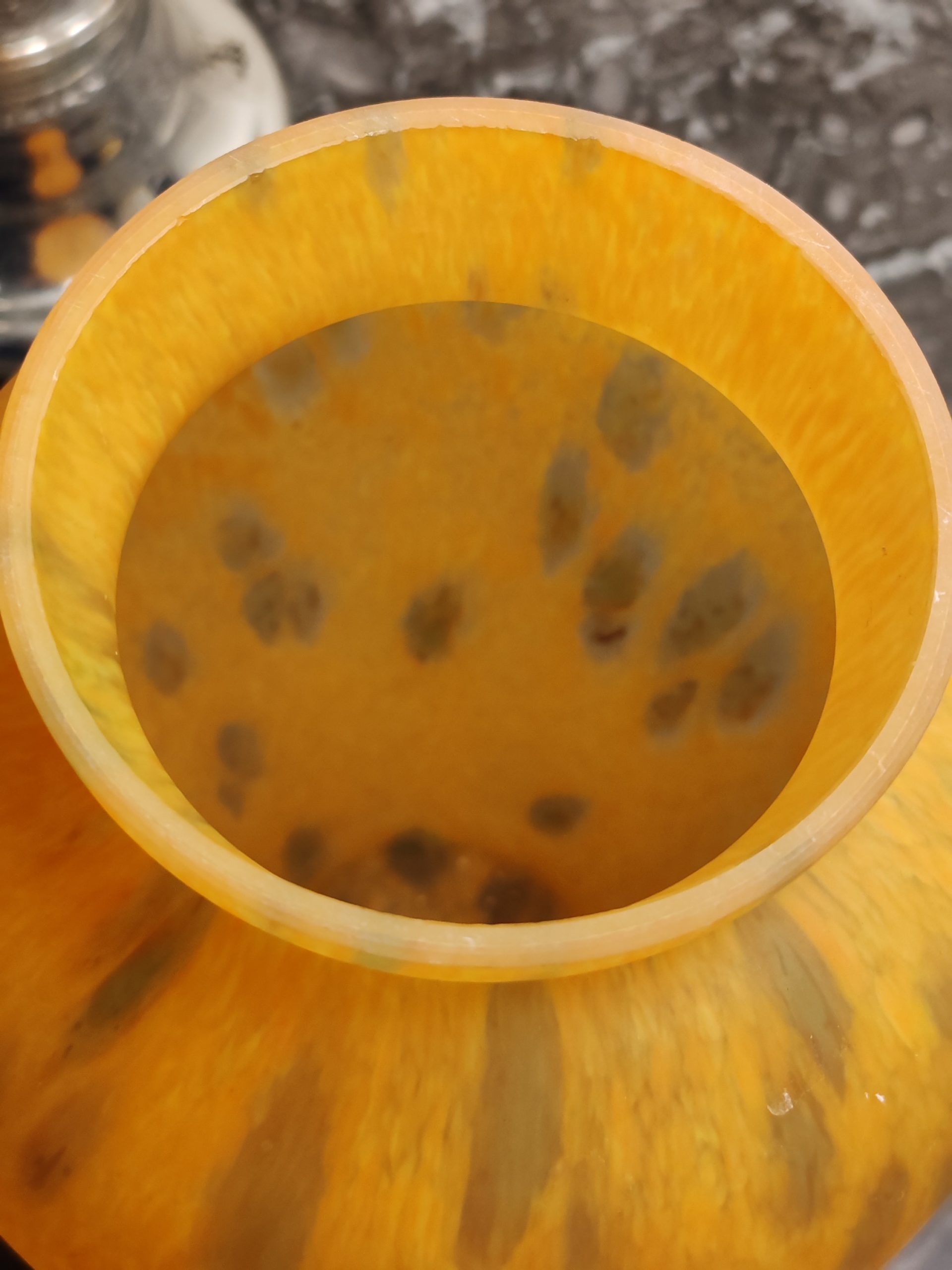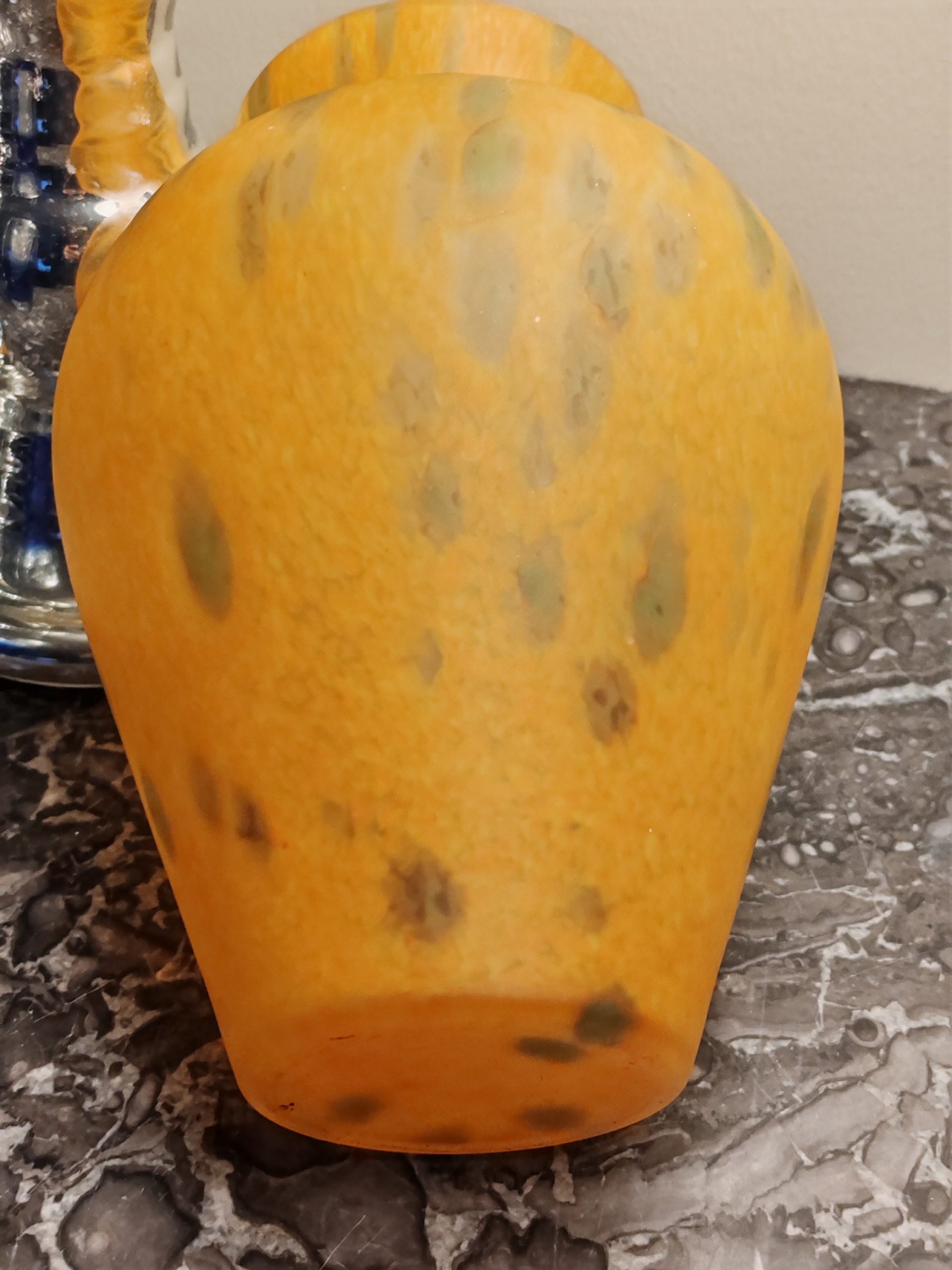 Vase en pâte de verre style Art Déco couleur orange appliquée en traits obliques. Belle transparence à la lumière.